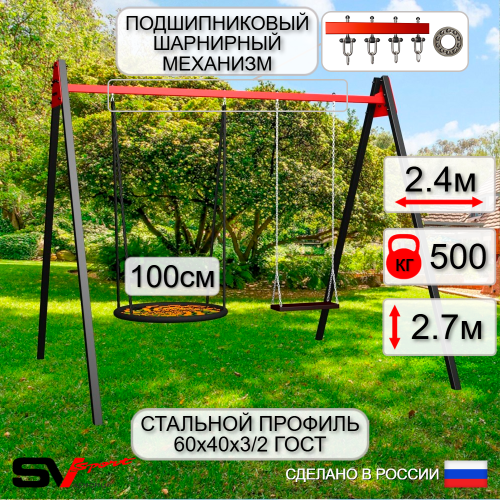 КОМПЛЕКТАЦИЯ: Каркас УК Sv Sport Maxi 2.4м, Качели - гнездо 100см, Качели деревянные на цепях Sv Sport, Подвесы для качелей на подшипниках Sv Sport 2 компл.