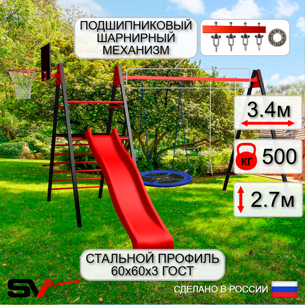 КОМПЛЕКТАЦИЯ: Каркас УК Sv Sport Maxi 3.4м, Щит баскетбольный Sv Sport c кронштейном к УК Sv Sport Maхi, Качели - гнездо Оксф. 100см, Качели деревянные на цепях Sv Sport, Комплект горка Sv Sport Махi к уличным качелям, Подвесы для качелей на подшипниках Sv Sport 2 компл.