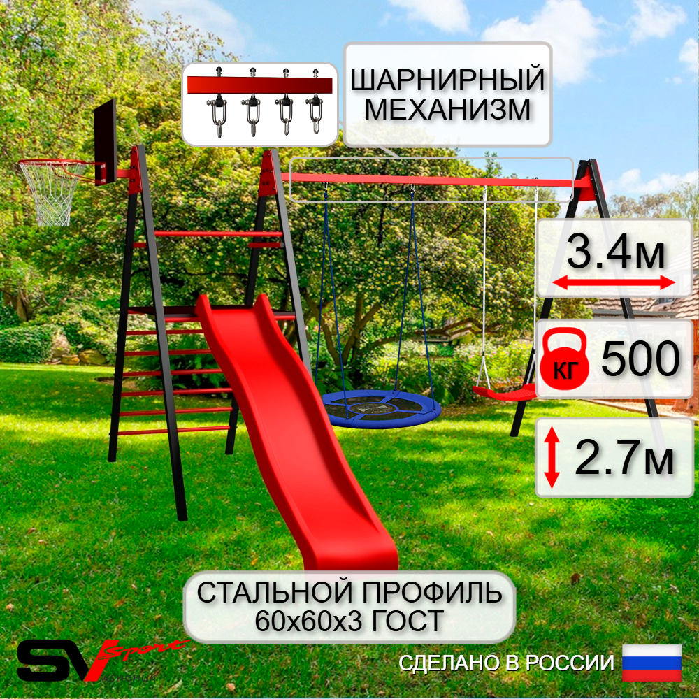 КОМПЛЕКТАЦИЯ: Каркас УК Sv Sport Maxi 3.4м, Щит баскетбольный Sv Sport c кронштейном к УК Sv Sport Maхi, Качели - гнездо Оксф. 100см, Качели пластиковые "Лодочка", Комплект горка Sv Sport Махi к уличным качелям, Подвесы для качелей на втулке Sv Sport 2 компл.