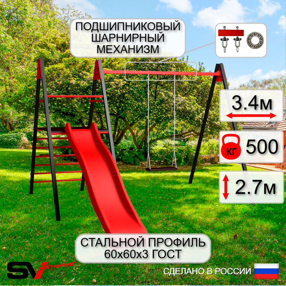 КОМПЛЕКТАЦИЯ: Каркас УК Sv Sport Maxi 3.4м, Качели деревянные на цепях Sv Sport, Комплект горка Sv Sport Махi к уличным качелям, Подвесы для качелей на подшипниках Sv Sport 1 компл.