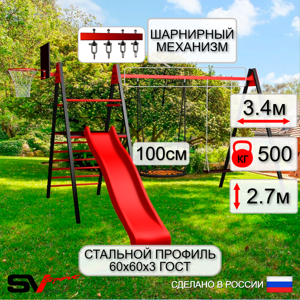 КОМПЛЕКТАЦИЯ: Каркас УК Sv Sport Maxi 3.4м, Щит баскетбольный Sv Sport c кронштейном к УК Sv Sport Maхi, Качели - гнездо 100см, Качели деревянные на цепях Sv Sport, Комплект горка Sv Sport Махi к уличным качелям, Подвесы для качелей на втулке Sv Sport 2 компл.