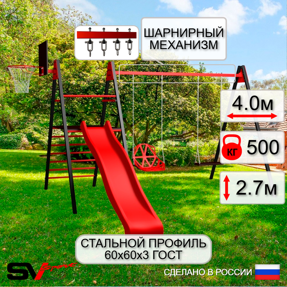 КОМПЛЕКТАЦИЯ: Каркас УК Sv Sport Maxi 4.0м, Щит баскетбольный Sv Sport c кронштейном к УК Sv Sport Maхi, Качели пластиковые со спинкой на цепях, Качели деревянные на цепях Sv Sport, Комплект горка Sv Sport Махi к уличным качелям, Подвесы для качелей на втулке Sv Sport 2 компл.