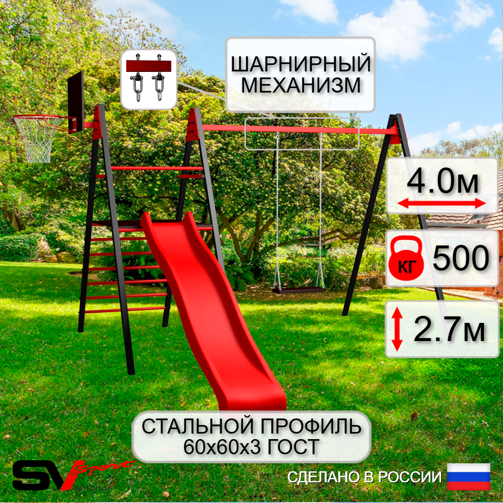 КОМПЛЕКТАЦИЯ: Каркас УК Sv Sport Maxi 4.0м, Щит баскетбольный Sv Sport c кронштейном к УК Sv Sport Maхi, Качели деревянные на цепях Sv Sport, Комплект горка Sv Sport Махi к уличным качелям, Подвесы для качелей на втулке Sv Sport 1 компл.