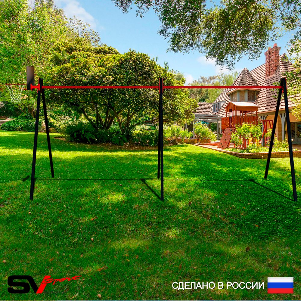 Уличные качели Sv Sport Maxi изготовлены из профильной трубы 60х60 мм, толщиной 3 мм. Крепление перекладины изготовлено из пластины, толщиной 8 мм. Окрашены уличные качели качественной, импортной порошковой краской в 2 слоя, которая устойчива к истиранию и температурным перепадам. Все торцы, болты, гайки заглушены пластиковыми заглушками отличного качества. Использующиеся болты и гайки оцинкованы и соответствуют требованиям ГОСТ. Устанавливаются путем бетонировки на глубину не менее 30 см.