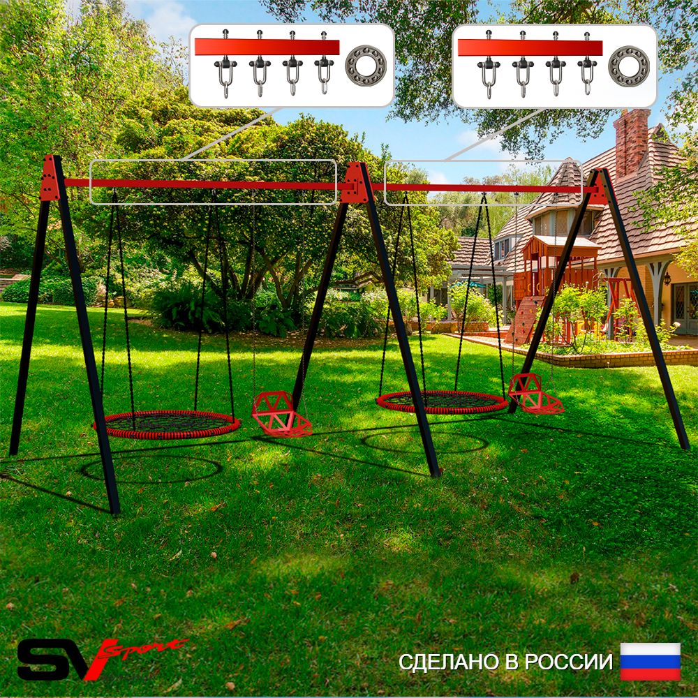 КОМПЛЕКТАЦИЯ: Каркас УК Sv Sport Maxi 5.4м, Качели - гнездо 80см 2шт, Качели пластиковые со спинкой на цепях 2шт, Подвесы для качелей на подшипниках Sv Sport 4 компл.