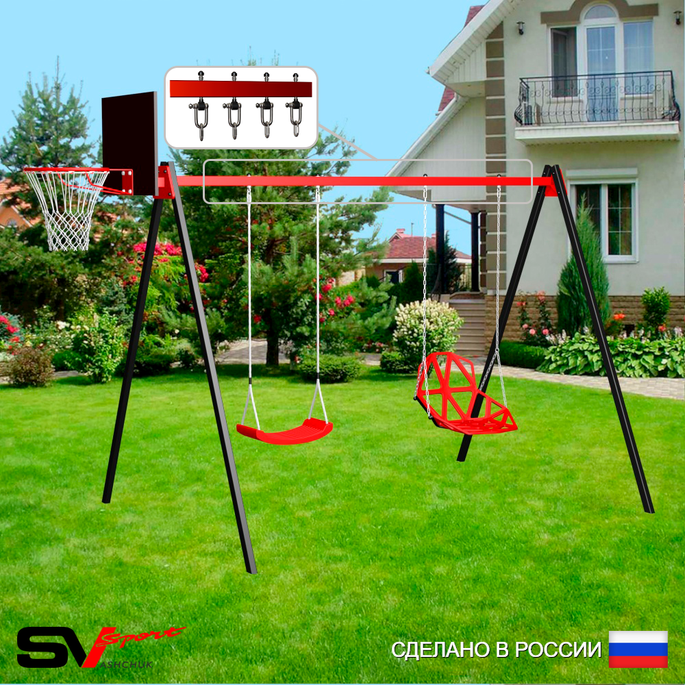 КОМПЛЕКТАЦИЯ: Каркас УК Sv Sport 3.0м, Щит баскетбольный Sv Sport c кронштейном к УК Sv Sport, Качели пластиковые "Лодочка", Качели пластиковые со спинкой на цепях, Подвесы для качелей на втулке Sv Sport 2 компл.