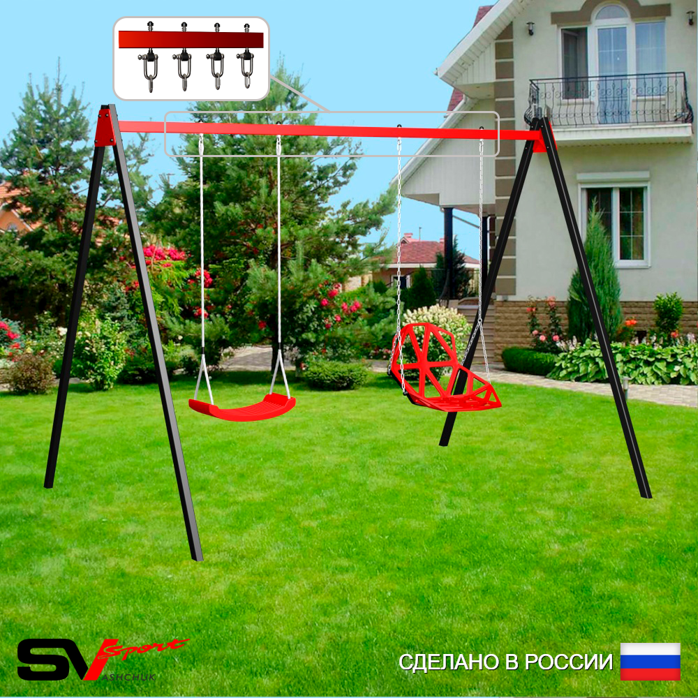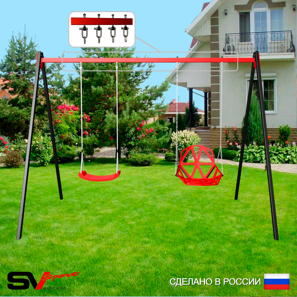 КОМПЛЕКТАЦИЯ: Каркас УК Sv Sport 3.0м, Качели пластиковые "Лодочка", Качели пластиковые со спинкой на цепях, Подвесы для качелей на втулке Sv Sport 2 компл.