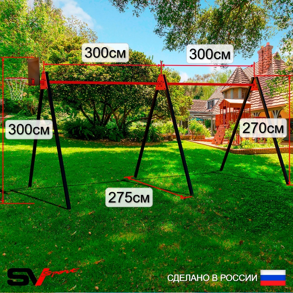 КОМПЛЕКТАЦИЯ: Каркас УК Sv Sport Maxi 6.0м, Щит баскетбольный Sv Sport c кронштейном к УК Sv Sport Maхi, Качели - гнездо 115см, Качели деревянные на цепях Sv Sport 2шт, Подвесы для качелей на подшипниках Sv Sport 3 компл.