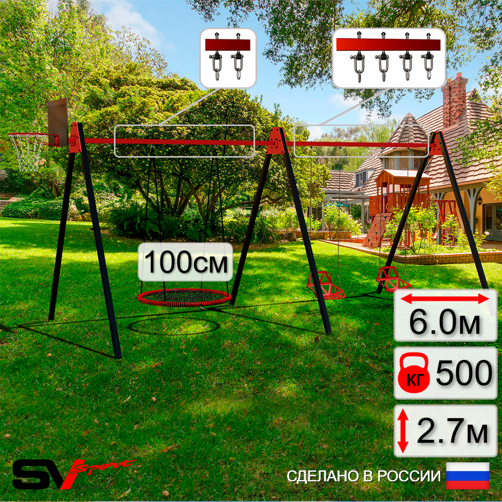 КОМПЛЕКТАЦИЯ: Каркас УК Sv Sport Maxi 6.0м, Щит баскетбольный Sv Sport c кронштейном к УК Sv Sport Maхi, Качели - гнездо 100см, Качели пластиковые со спинкой на цепях 2шт, Подвесы для качелей на втулке Sv Sport 3 компл.