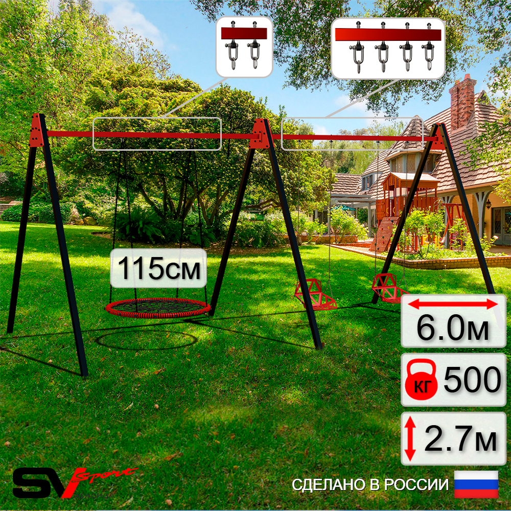 КОМПЛЕКТАЦИЯ: Каркас УК Sv Sport Maxi 6.0м, Качели - гнездо 115см, Качели пластиковые со спинкой на цепях 2шт, Подвесы для качелей на втулке Sv Sport 3 компл.