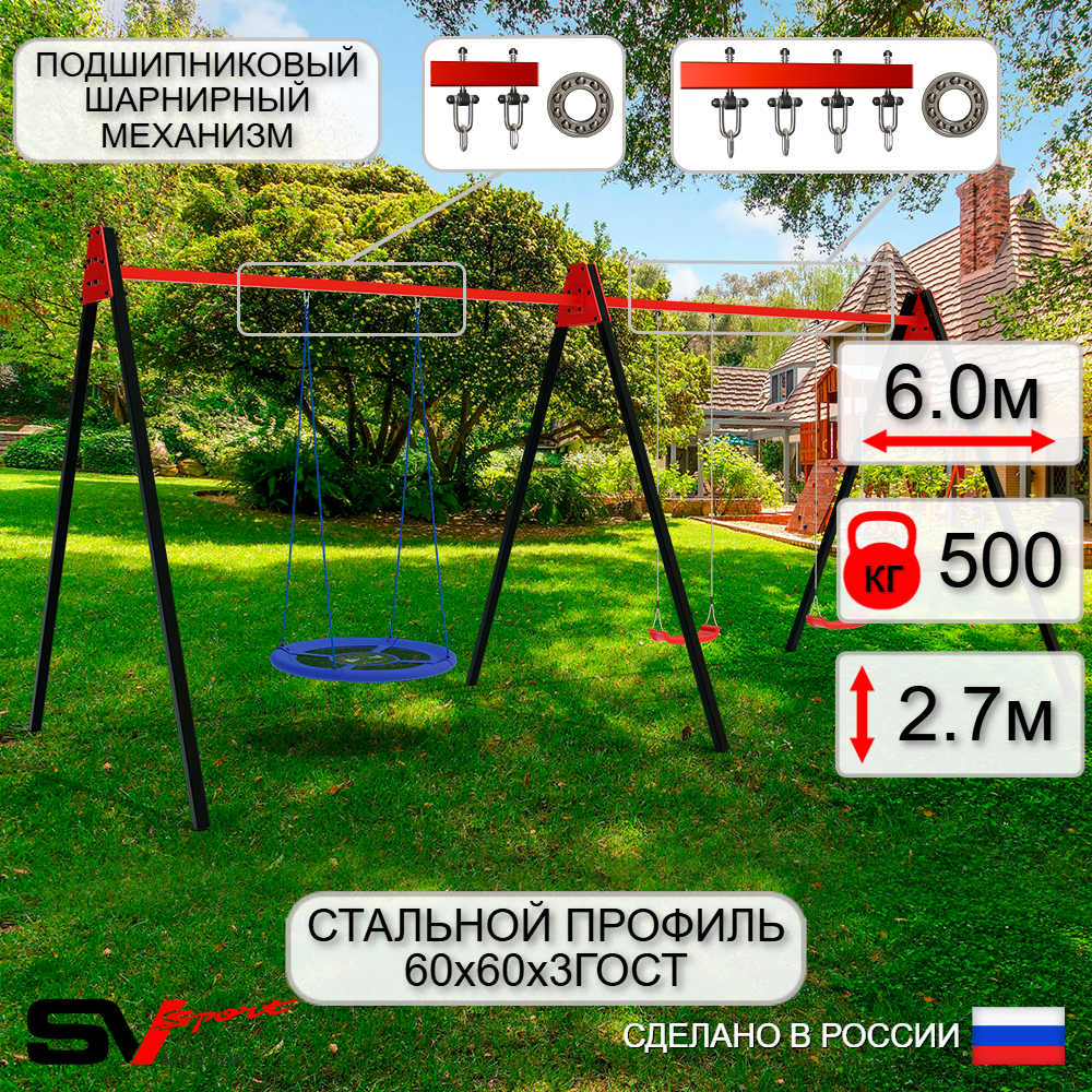 КОМПЛЕКТАЦИЯ: Каркас УК Sv Sport Maxi 6.0м, Качели - гнездо Оксф. 100см, Качели пластиковые "Лодочка" 2шт, Подвесы для качелей на подшипниках Sv Sport 3 компл.