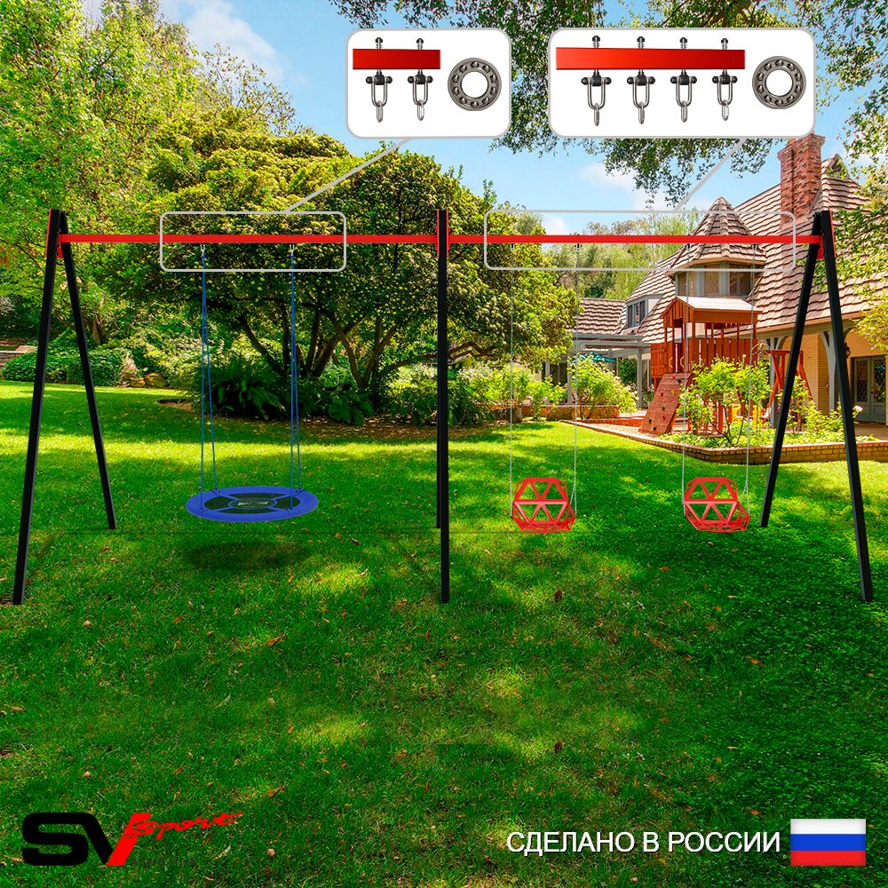 КОМПЛЕКТАЦИЯ: Каркас УК Sv Sport Maxi 6.0м, Качели - гнездо Оксф. 100см, Качели пластиковые со спинкой на цепях 2шт, Подвесы для качелей на подшипниках Sv Sport 3 компл.