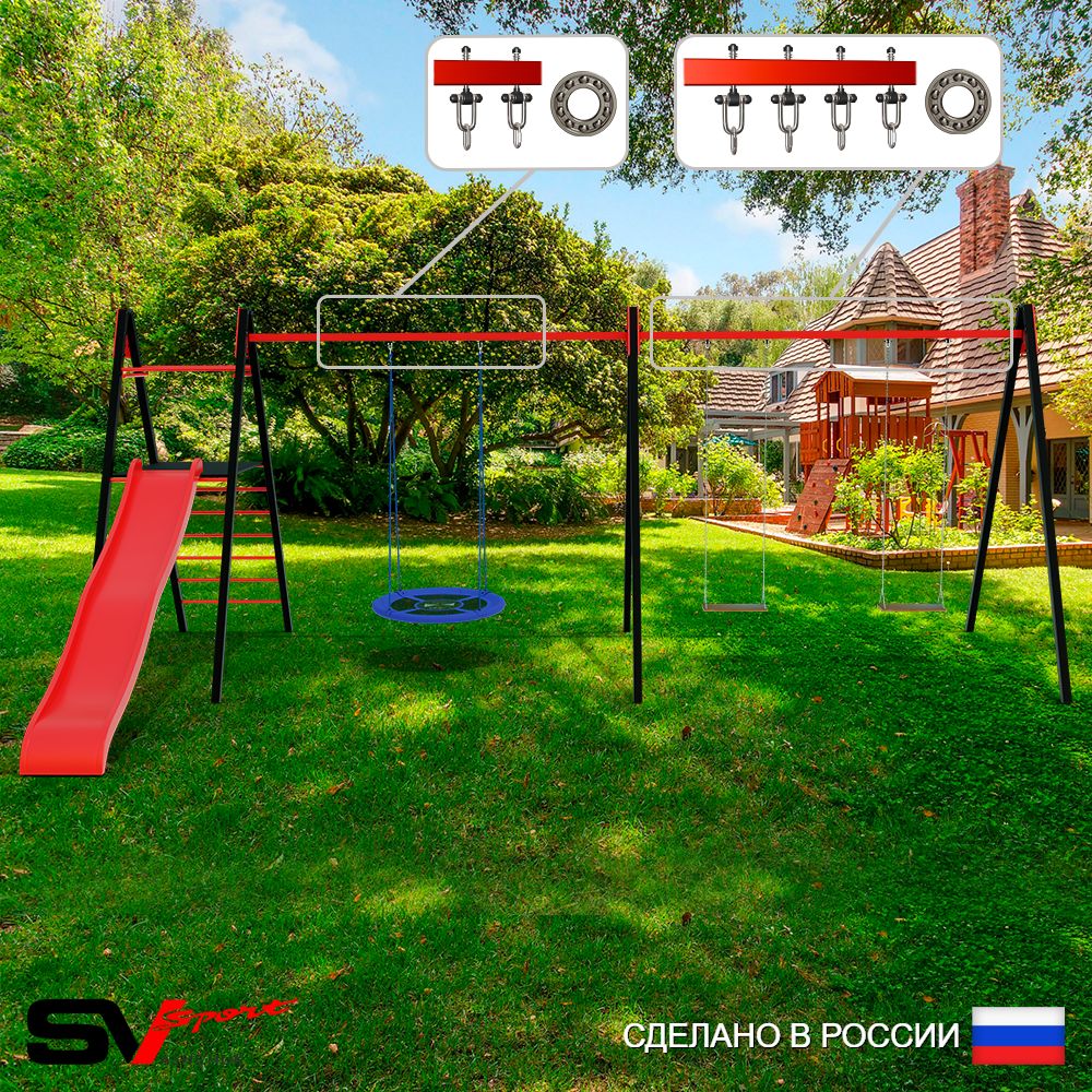 КОМПЛЕКТАЦИЯ: Каркас УК Sv Sport Maxi 6.4м, Качели - гнездо Оксф. 100см, Качели деревянные на цепях Sv Sport 2шт, Комплект горка Sv Sport Махi к уличным качелям, Подвесы для качелей на подшипниках Sv Sport 3 компл.