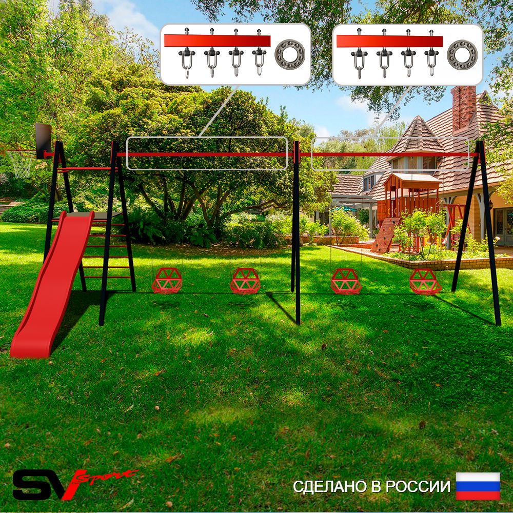 КОМПЛЕКТАЦИЯ: Каркас УК Sv Sport Maxi 5.8м, Щит баскетбольный Sv Sport c кронштейном к УК Sv Sport Maхi, Качели пластиковые со спинкой на цепях 4шт, Комплект горка Sv Sport Махi к уличным качелям, Подвесы для качелей на подшипниках Sv Sport 4 компл.