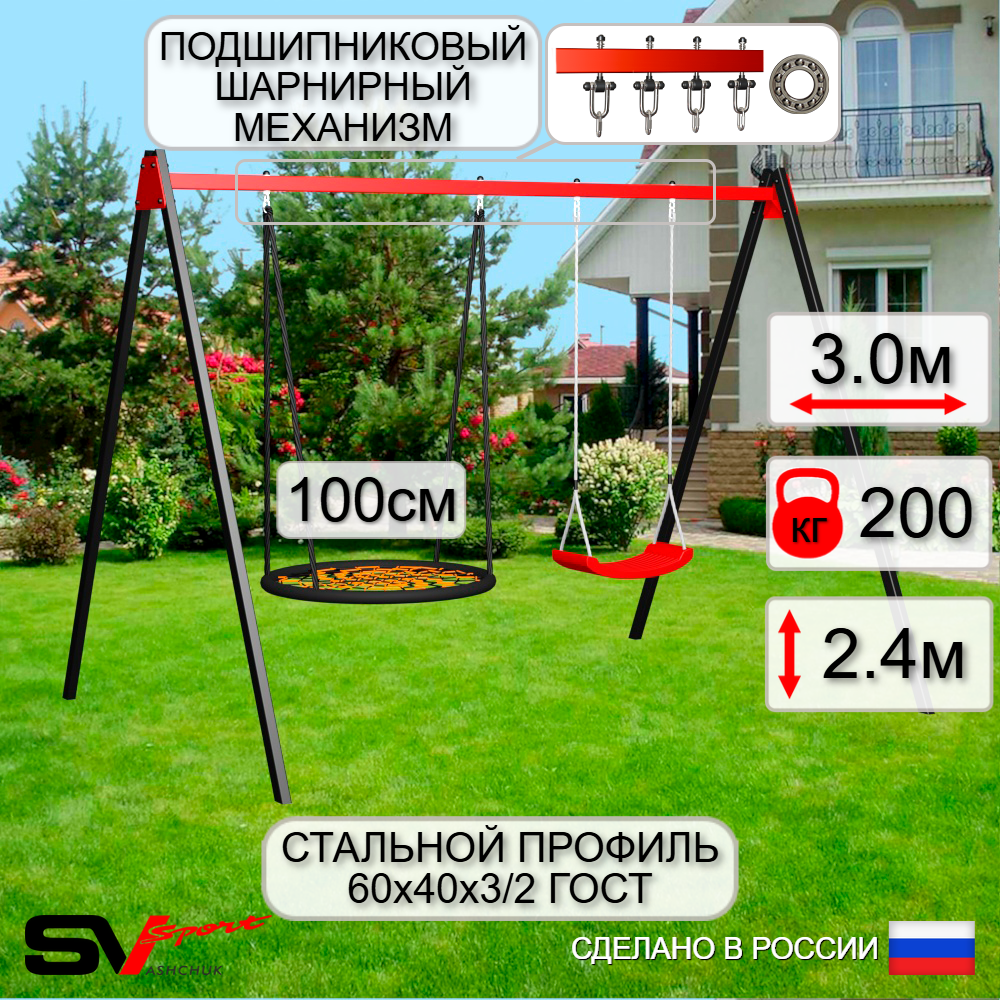 КОМПЛЕКТАЦИЯ: Каркас УК Sv Sport 3.0м, Качели - гнездо 100см, Качели пластиковые "Лодочка", Подвесы для качелей на подшипниках Sv Sport 2 компл.