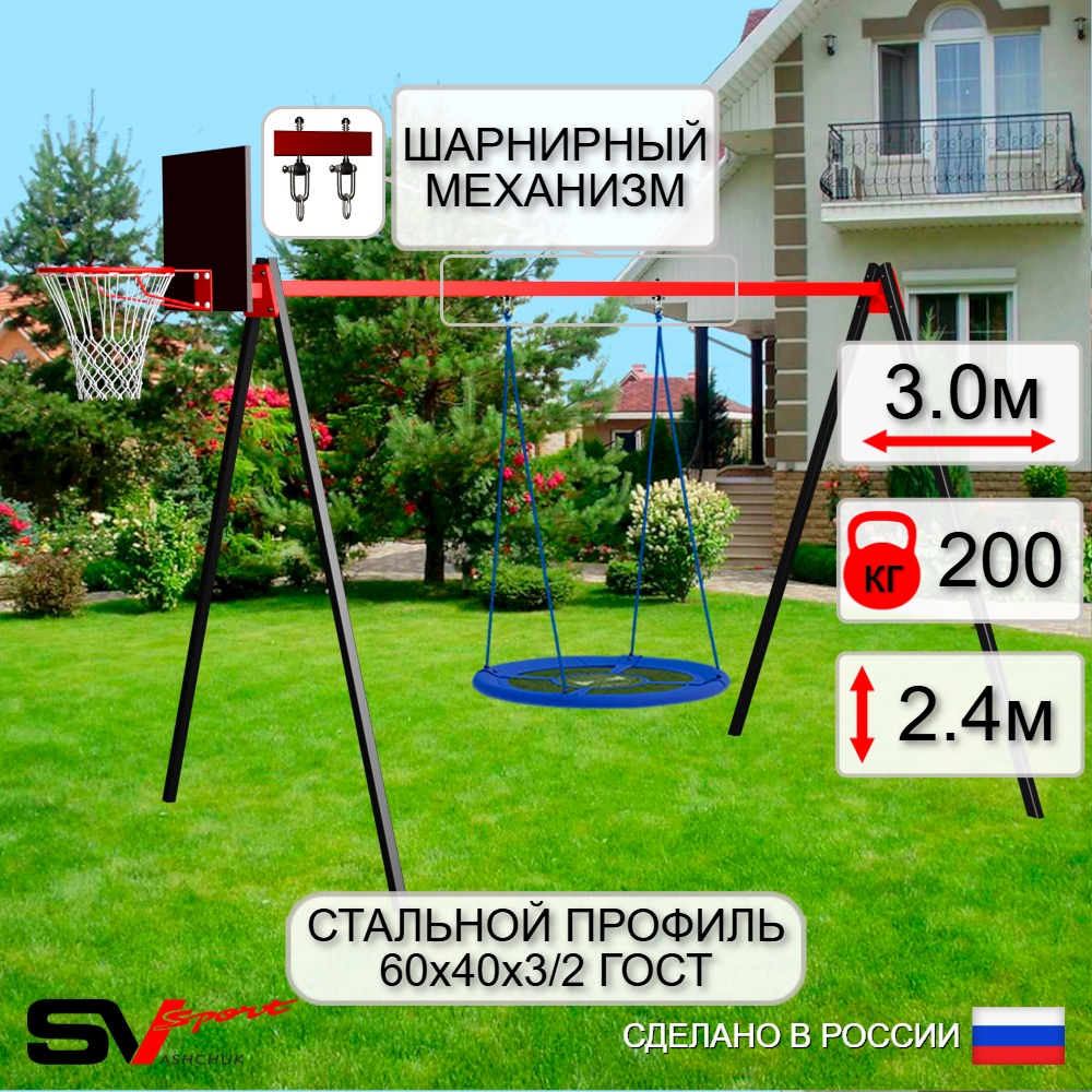 КОМПЛЕКТАЦИЯ: Каркас УК Sv Sport 3.0м, Щит баскетбольный Sv Sport c кронштейном к УК Sv Sport, Качели - гнездо Оксф. 100см, Подвесы для качелей на втулке Sv Sport 1 компл.