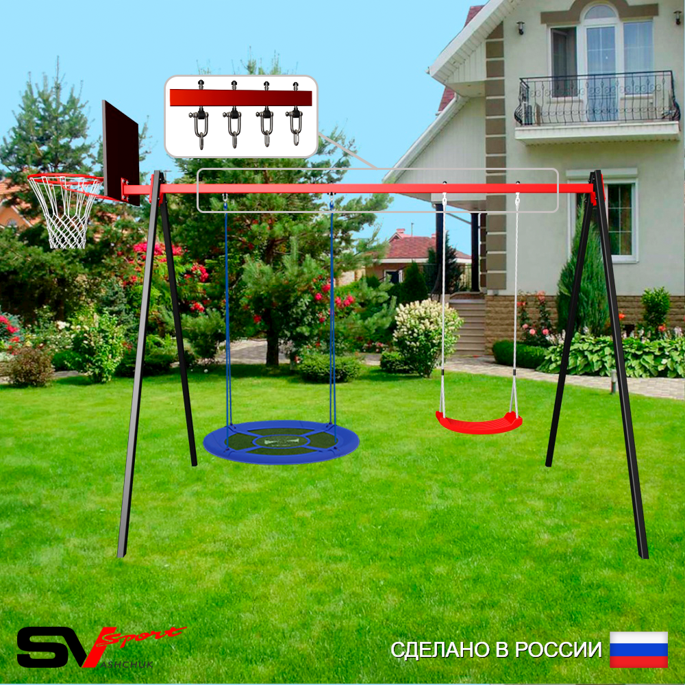 КОМПЛЕКТАЦИЯ: Каркас УК Sv Sport 3.0м, Щит баскетбольный Sv Sport c кронштейном к УК Sv Sport, Качели - гнездо Оксф. 100см, Качели пластиковые "Лодочка", Подвесы для качелей на втулке Sv Sport 2 компл.