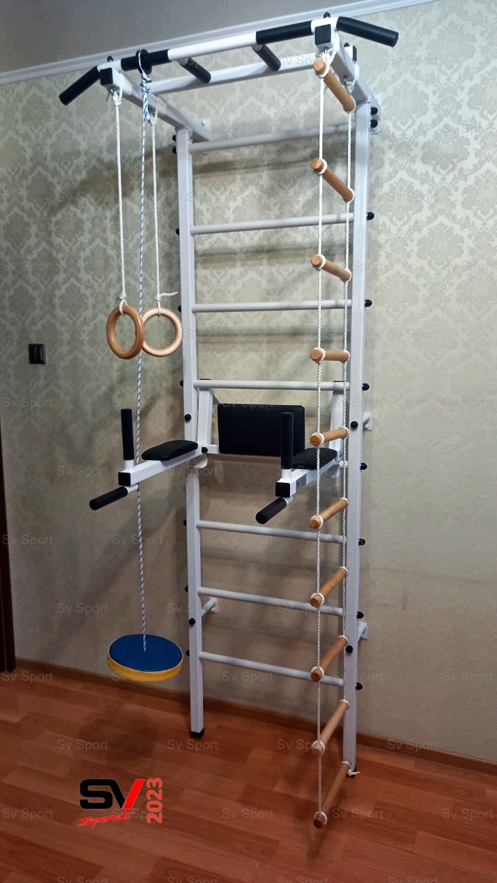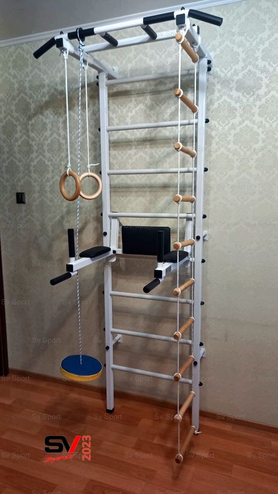 КОМПЛЕКТАЦИЯ: Шведская стенка Sv Pro, Турник Sv Pro к ШС, Брусья\стойка под штангу Sv Pro к ШС, Kольца деревянные, Лестница веревочная.