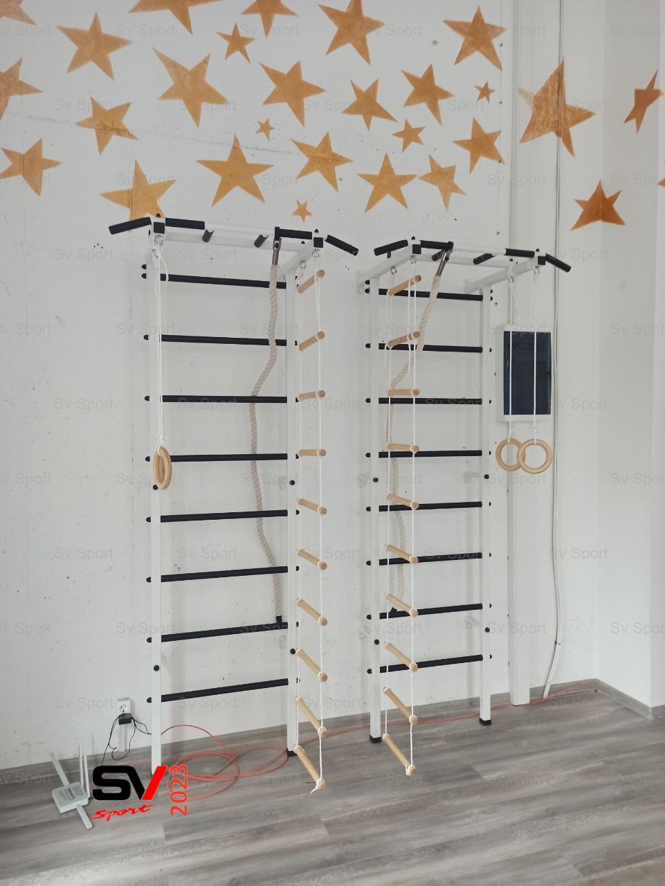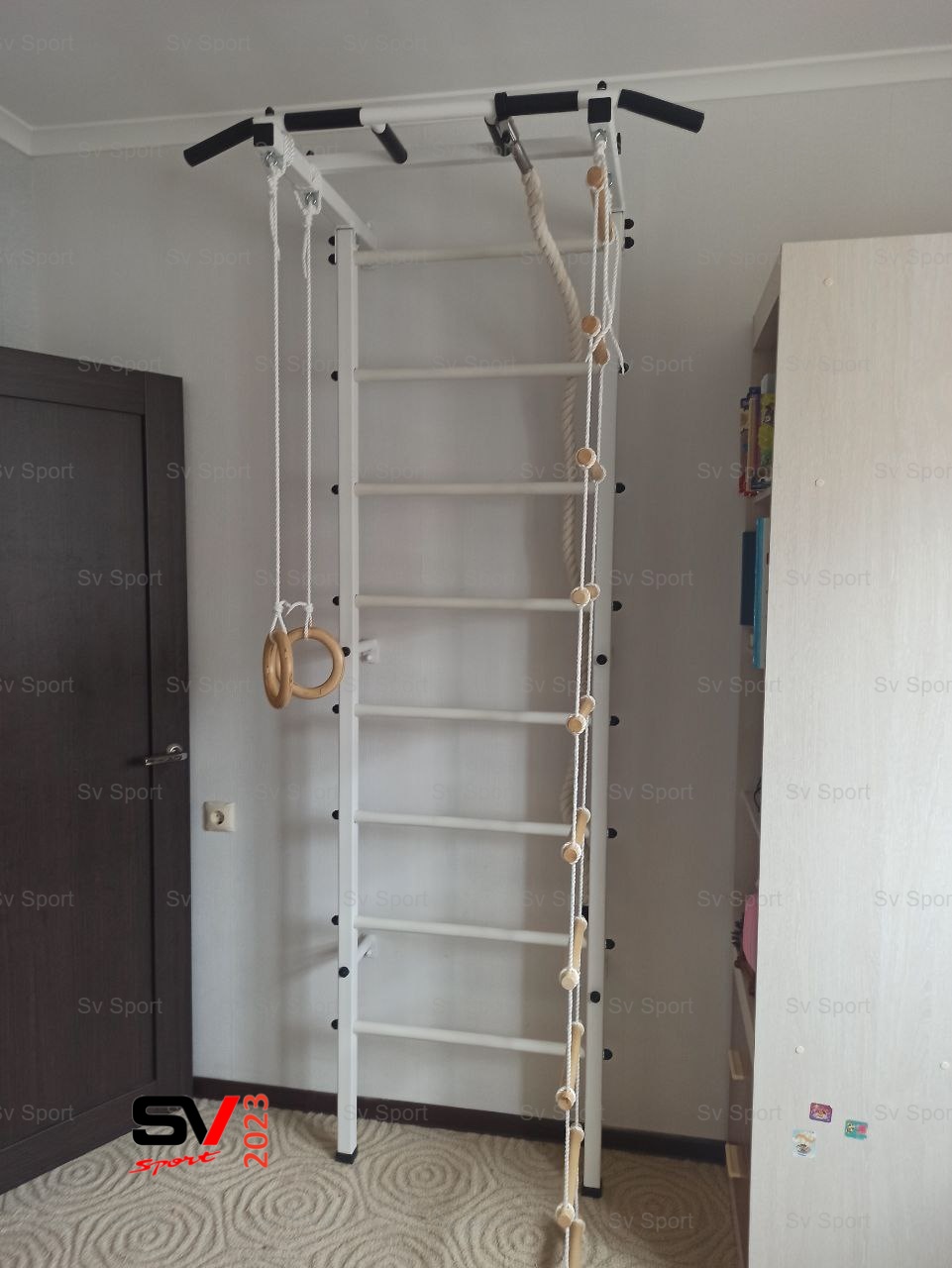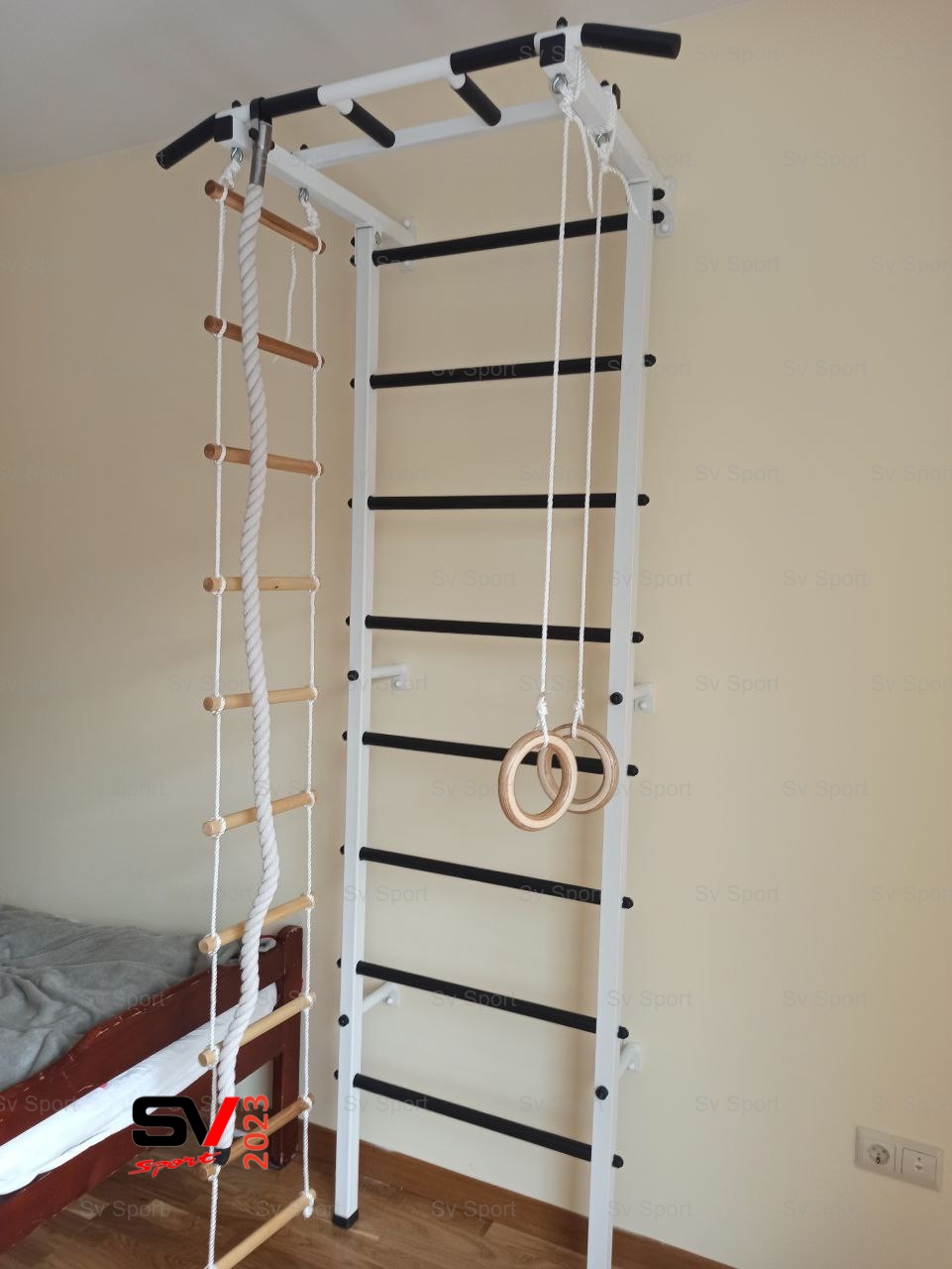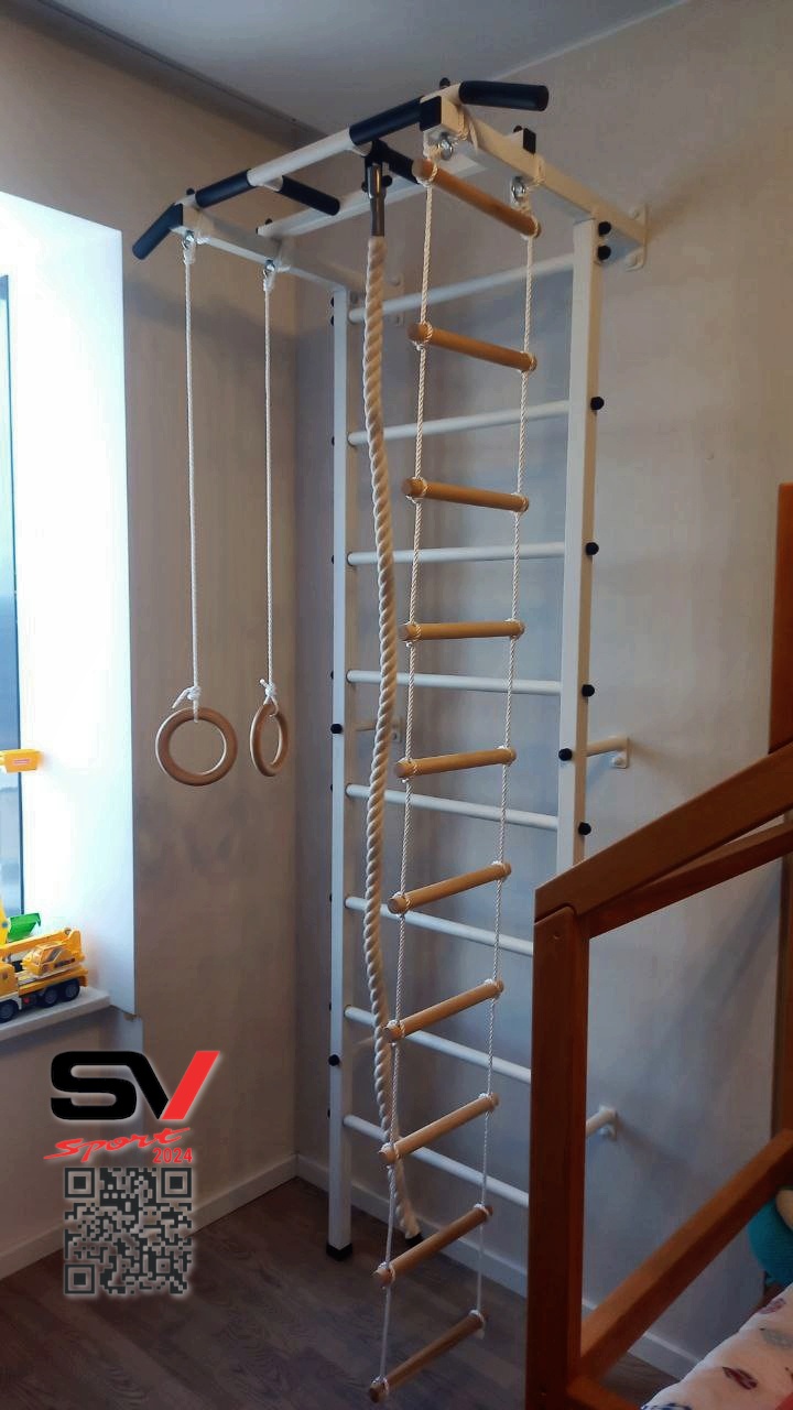 КОМПЛЕКТАЦИЯ: Шведская стенка Sv Pro, Турник Sv Pro к ШС, Kанат, Kольца деревянные, Лестница веревочная.