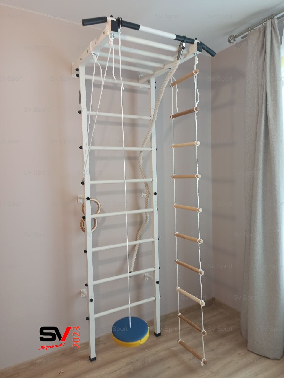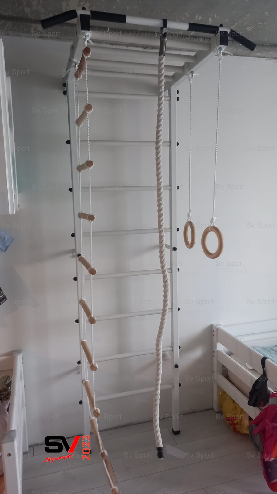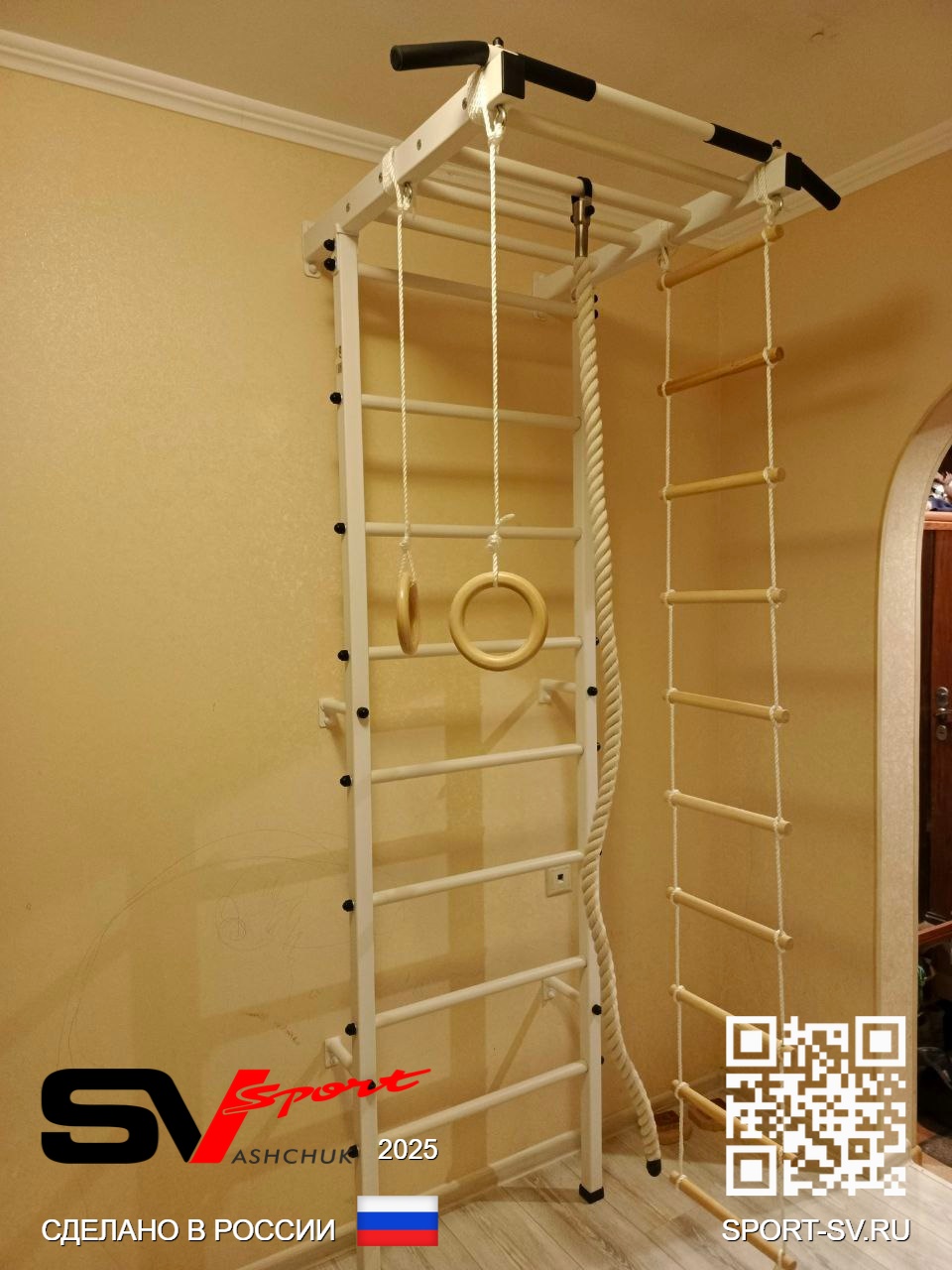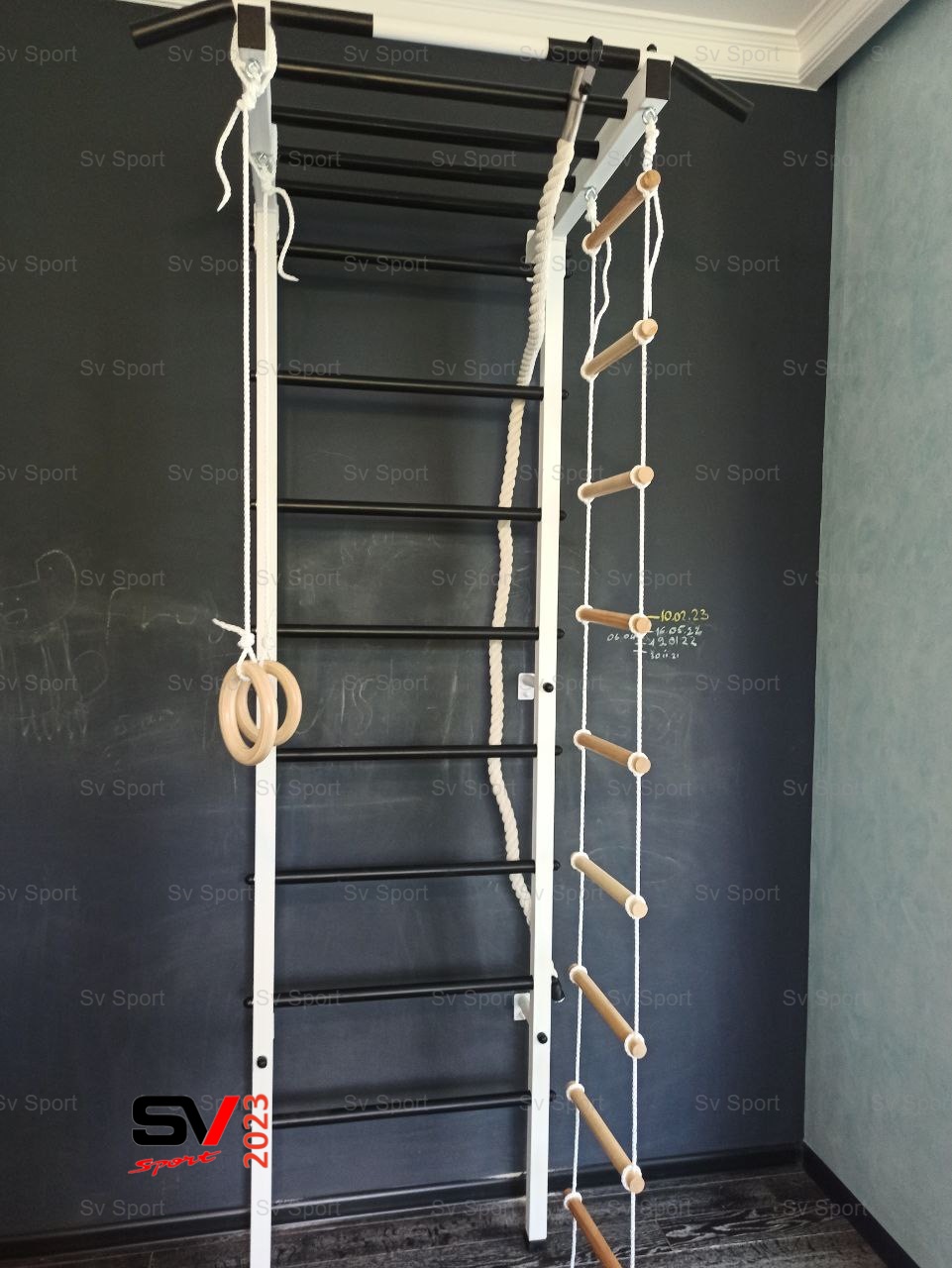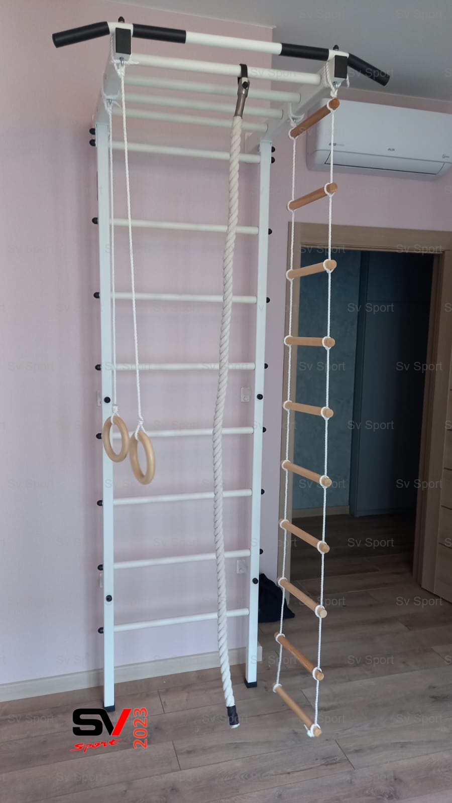 КОМПЛЕКТАЦИЯ: Шведская стенка Sv Pro, Турник Sv Pro рукоход к ШС, Kанат, Kольца деревянные, Лестница веревочная.