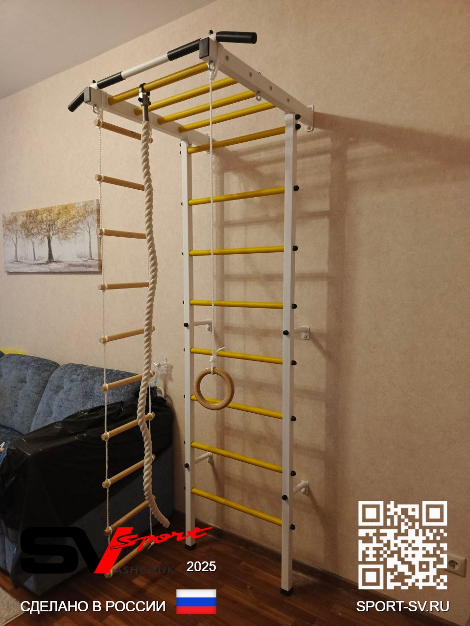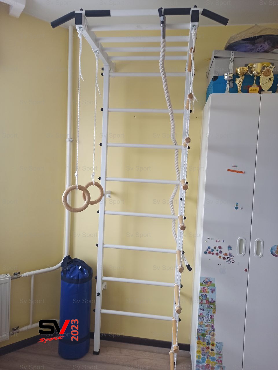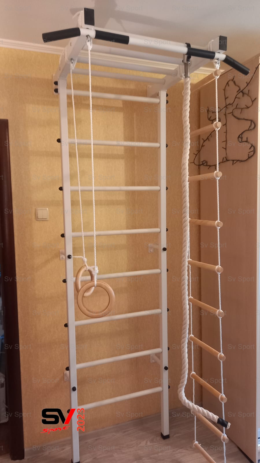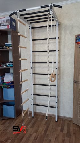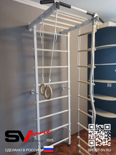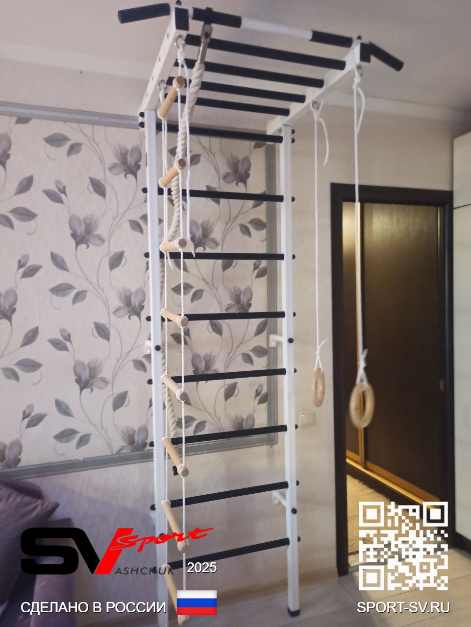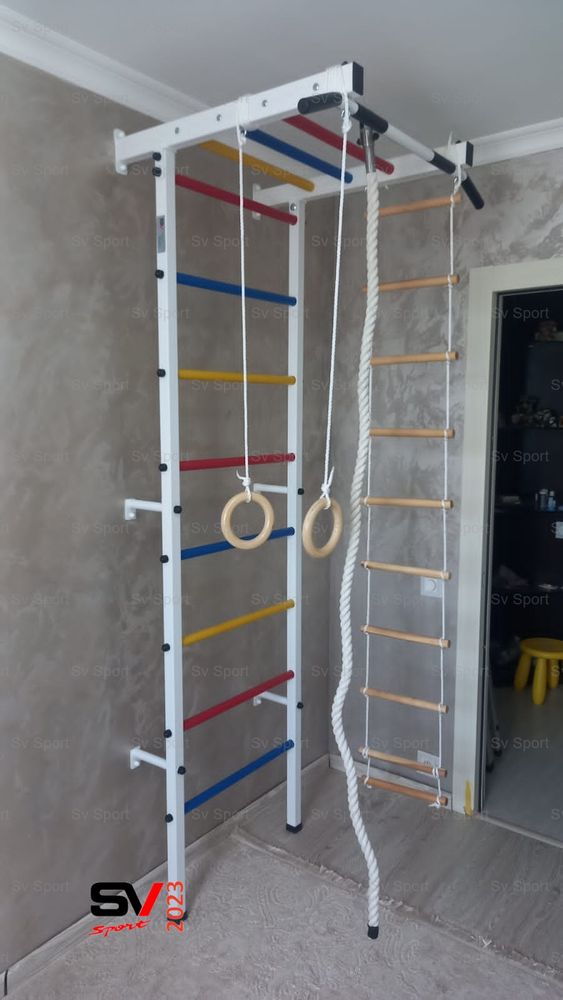 КОМПЛЕКТАЦИЯ: Шведская стенка Sv Pro, Турник Sv Pro рукоход к ШС, Kанат, Kольца деревянные, Лестница веревочная.