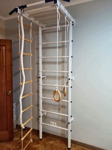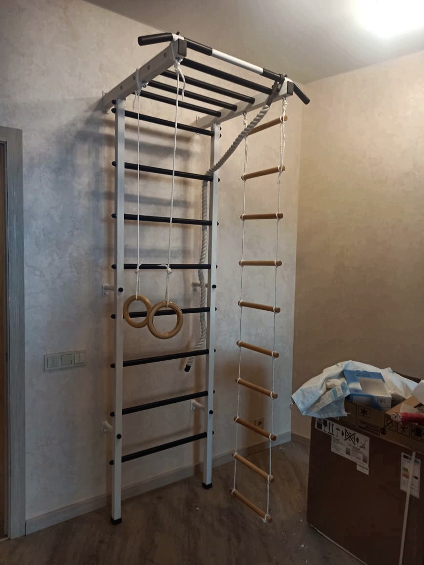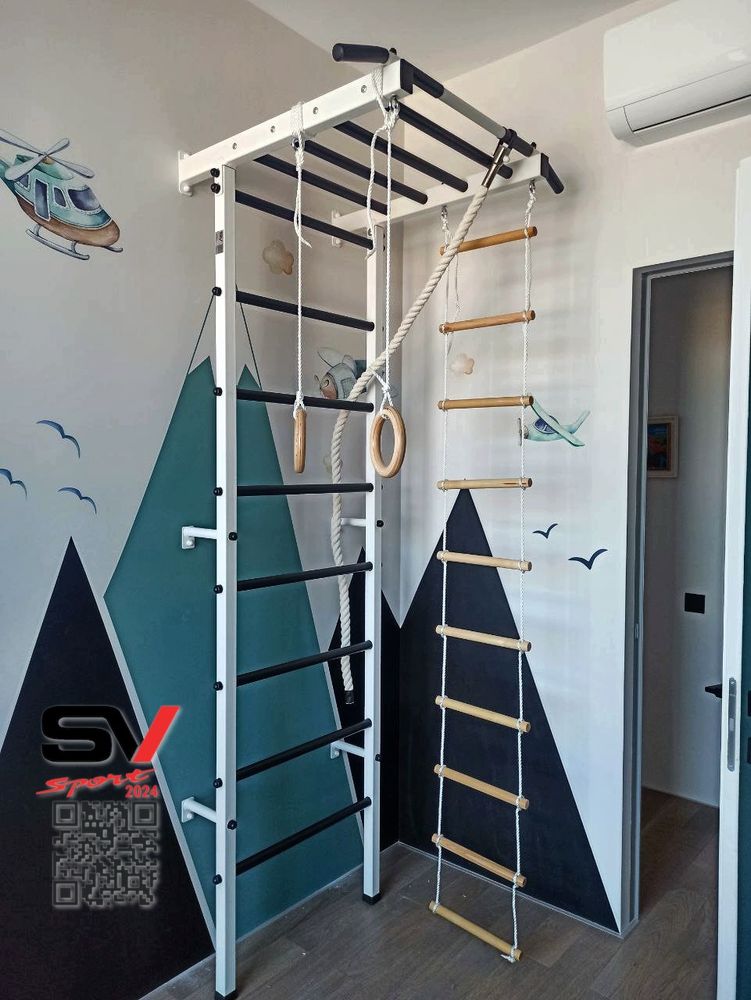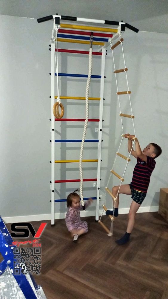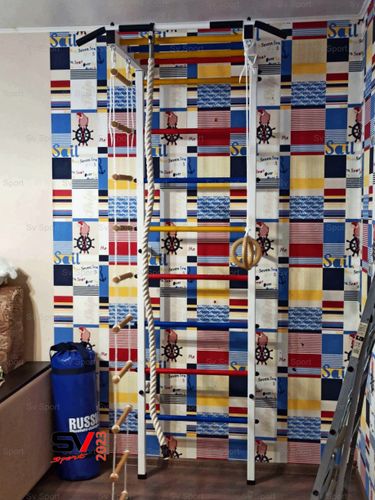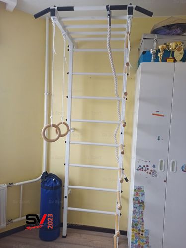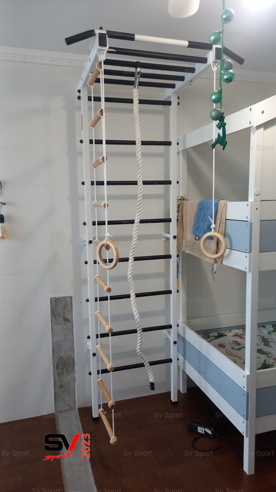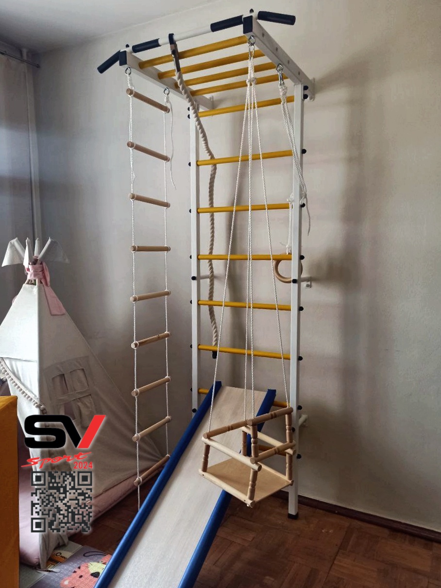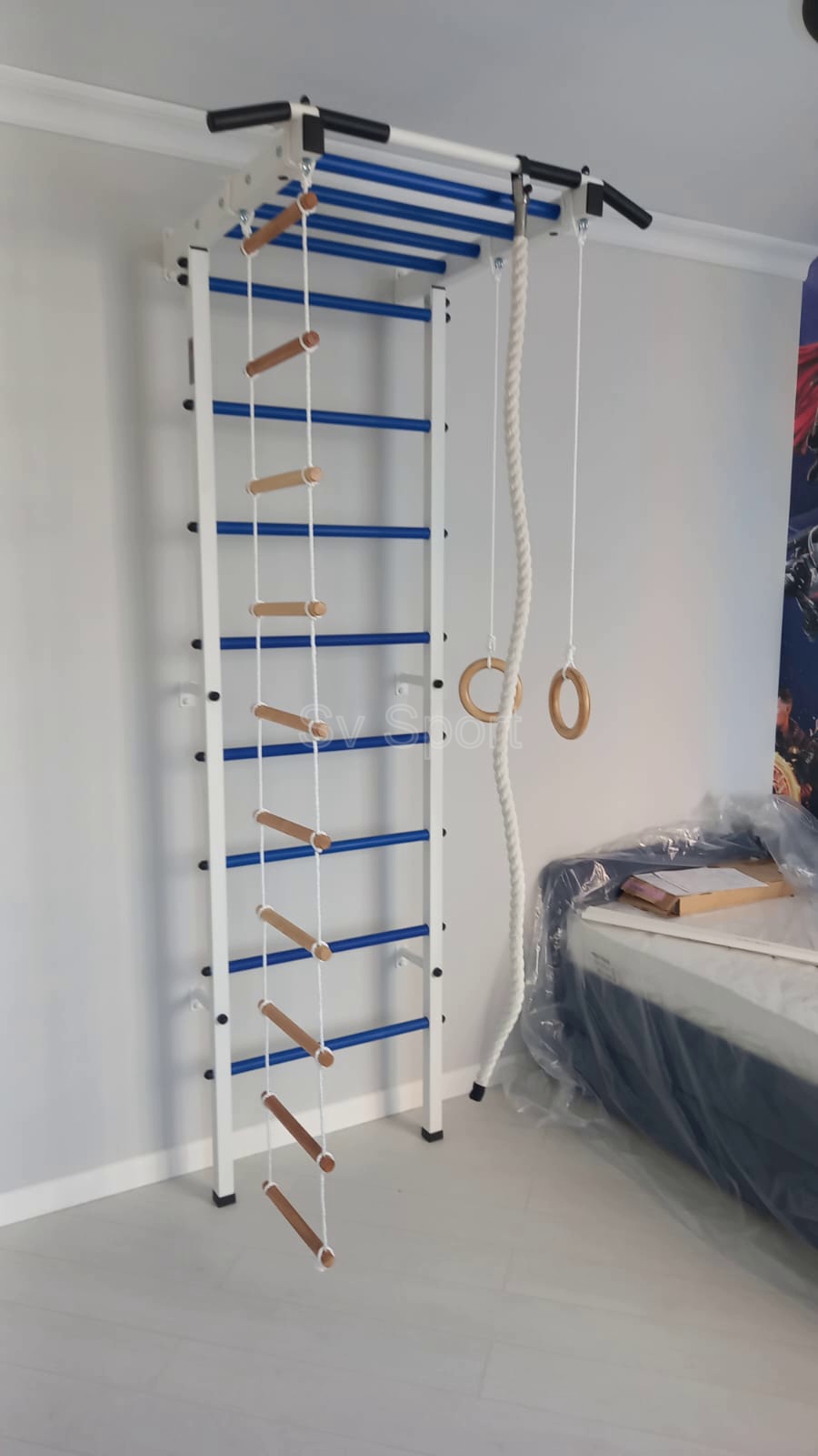 КОМПЛЕКТАЦИЯ: Шведская стенка Sv Pro, Турник Sv Pro рукоход к ШС, Kанат, Kольца деревянные, Лестница веревочная.
