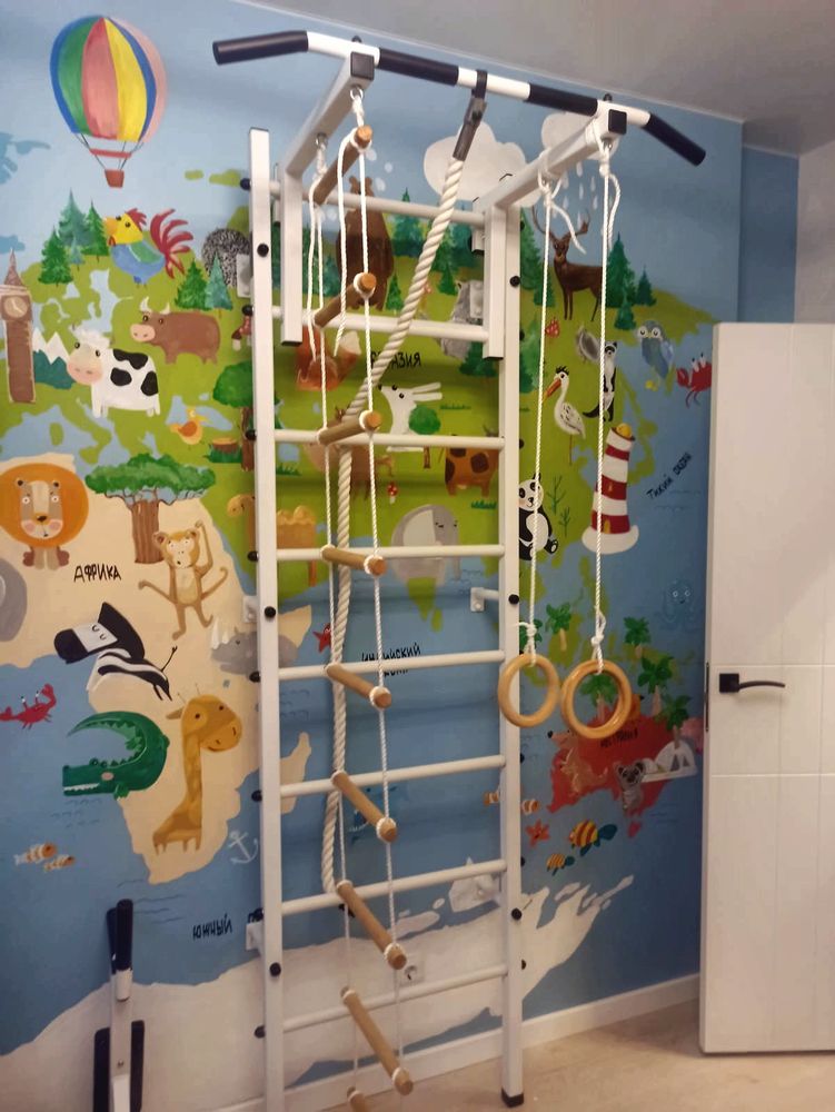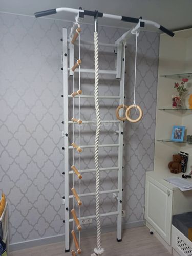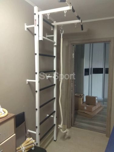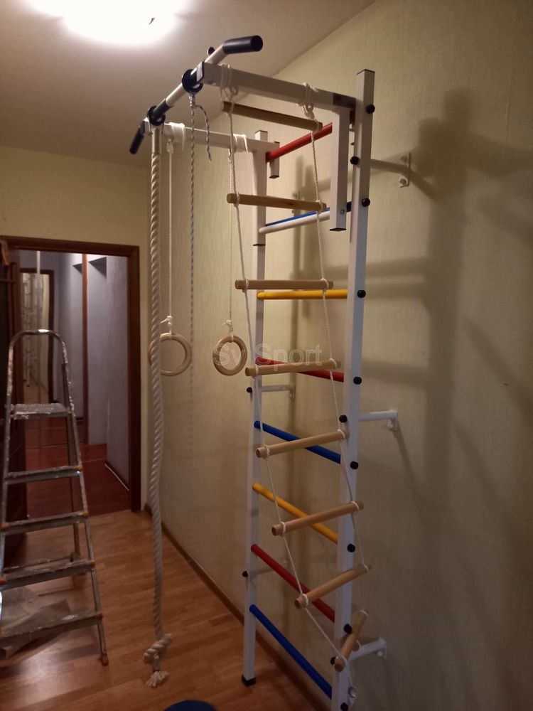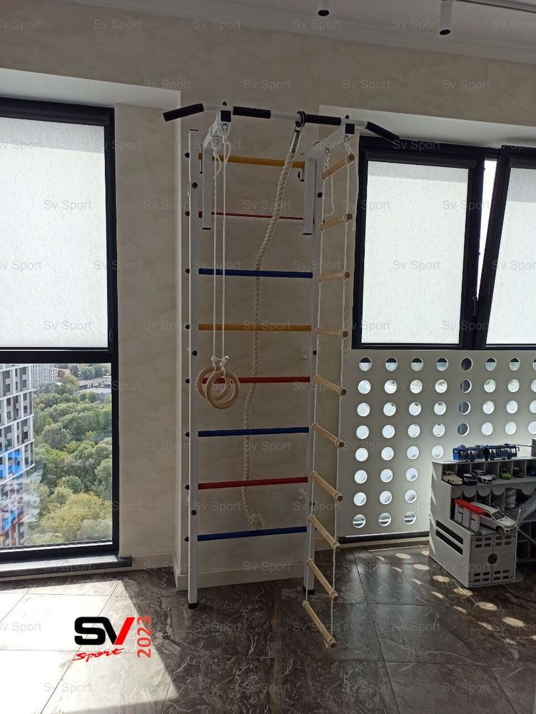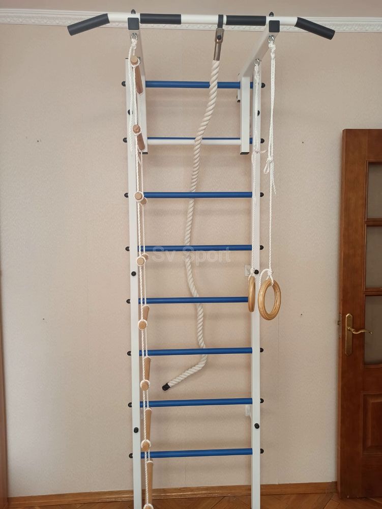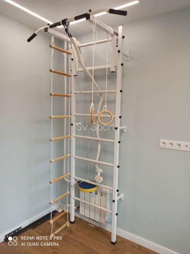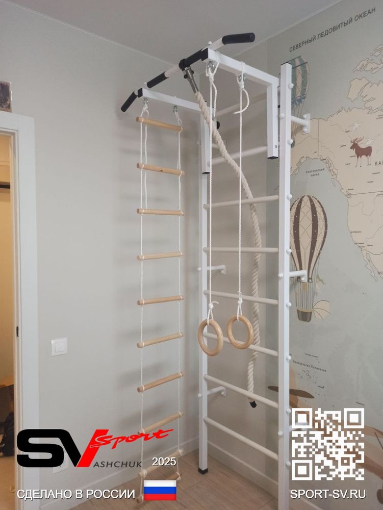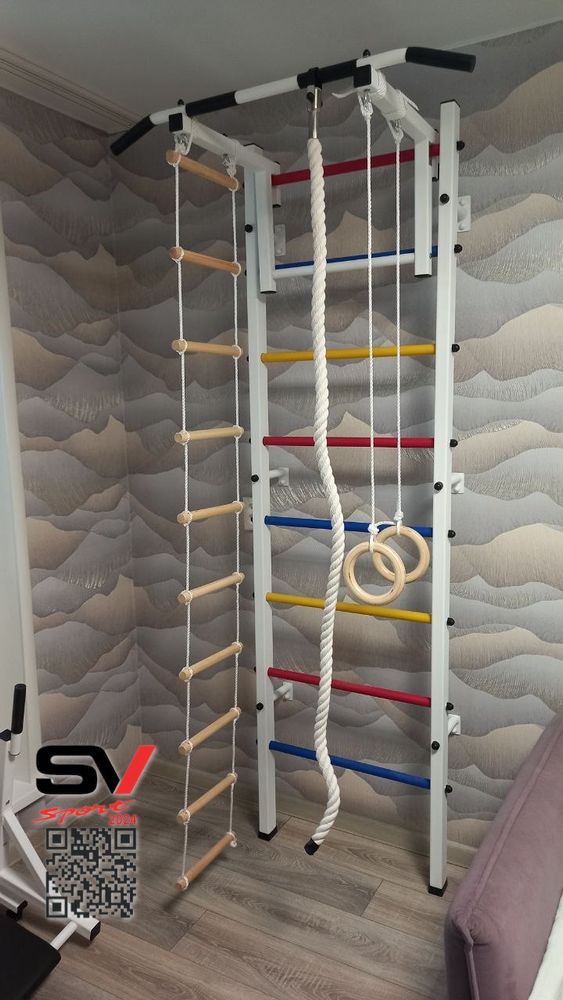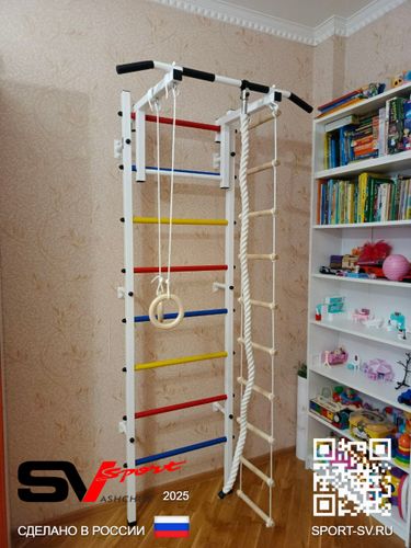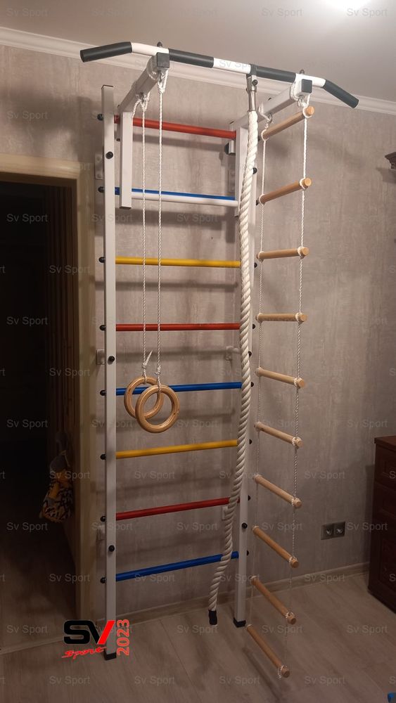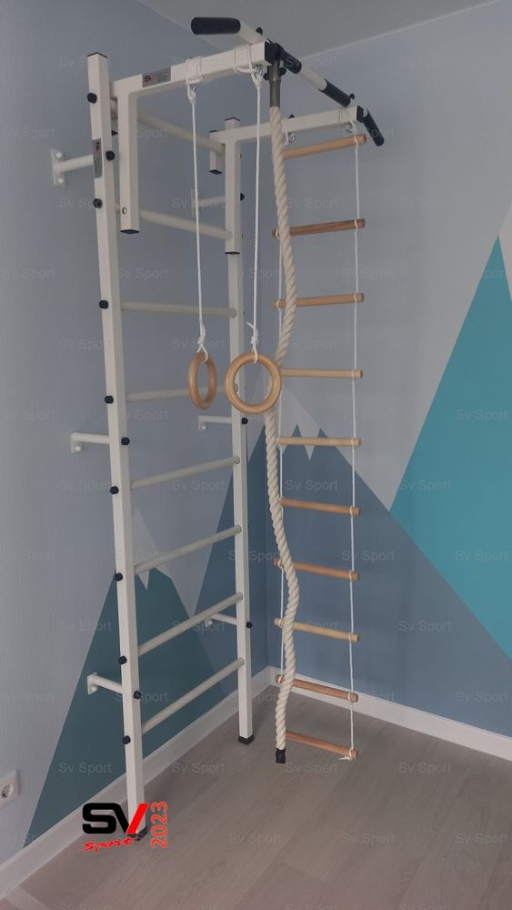 КОМПЛЕКТАЦИЯ: Шведская стенка Sv Sport (профиль вертикальных стоек 40 х 40 х 2 мм), Турник Sv Sport стандарт к ШС, Kанат, Kольца деревянные, Лестница веревочная.