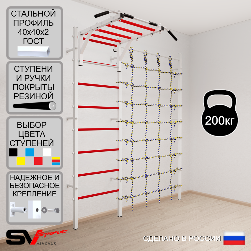 КОМПЛЕКТАЦИЯ: Шведская стенка Sv Sport (профиль вертикальных стоек 40 х 40 х 2 мм), Турник Sv Sport рукоход к ШС, Канатный лаз.
