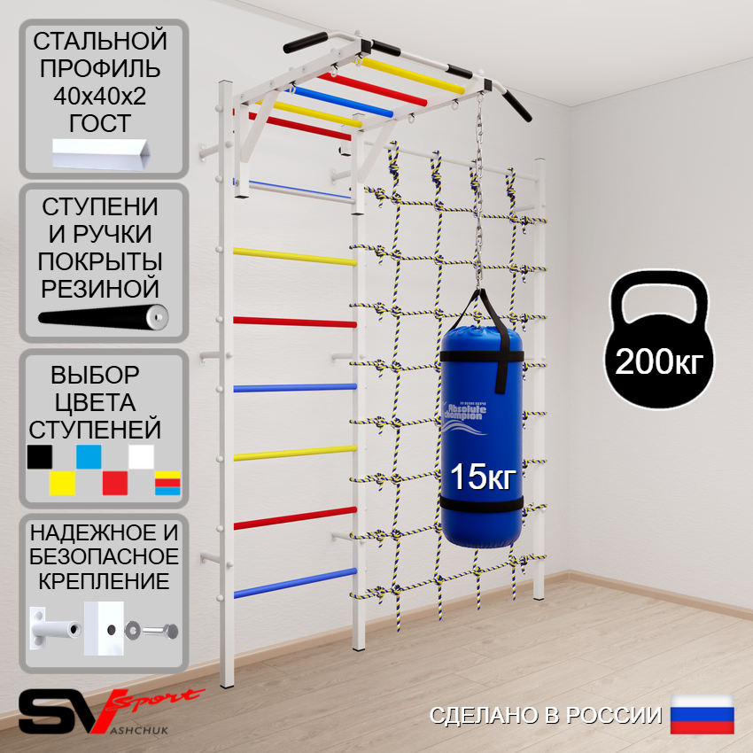 КОМПЛЕКТАЦИЯ: Шведская стенка Sv Sport (профиль вертикальных стоек 40 х 40 х 2 мм), Турник Sv Sport рукоход к ШС, Цепь удлинитель 90см, Мешок боксерский 15кг, Канатный лаз.