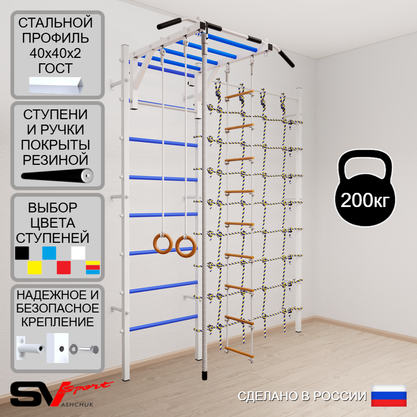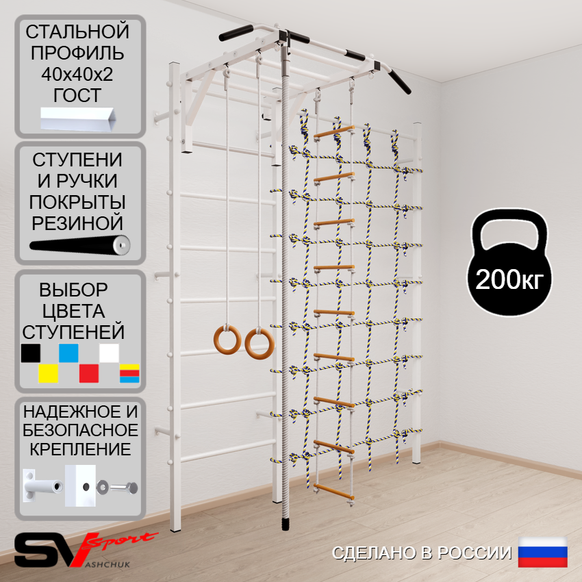 КОМПЛЕКТАЦИЯ: Шведская стенка Sv Sport (профиль вертикальных стоек 40 х 40 х 2 мм), Турник Sv Sport рукоход к ШС, Kанат, Kольца деревянные, Лестница веревочная, Канатный лаз.