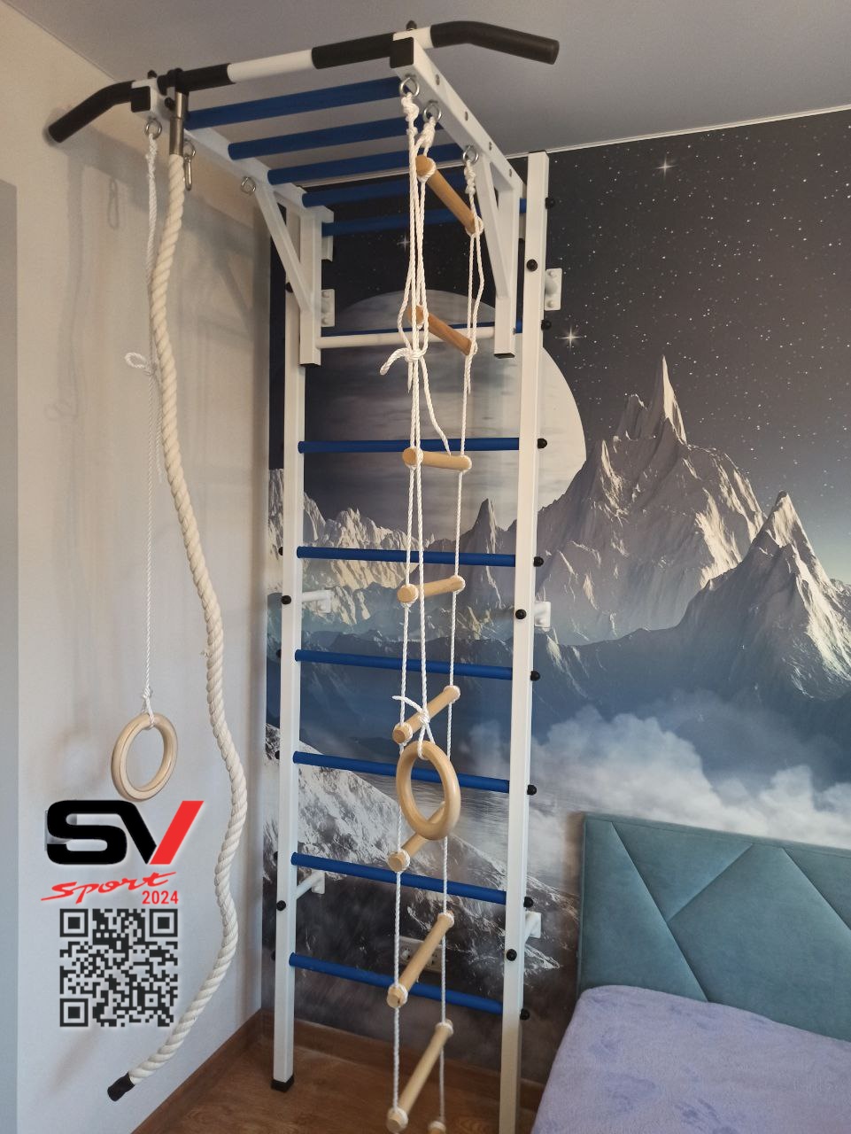 КОМПЛЕКТАЦИЯ: Шведская стенка Sv Sport (профиль вертикальных стоек 40 х 40 х 2 мм), Турник Sv Sport рукоход к ШС, Kанат, Kольца деревянные, Лестница веревочная.