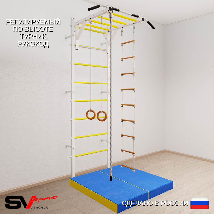 КОМПЛЕКТАЦИЯ: Шведская стенка Sv Sport (профиль вертикальных стоек 40 х 40 х 2 мм), Турник Sv Sport рукоход к ШС, Kанат, Kольца деревянные, Лестница веревочная, Спортивный мат 100 х 100 х 10 см складной.