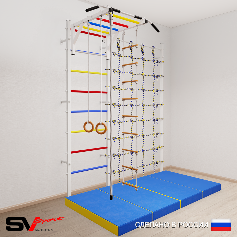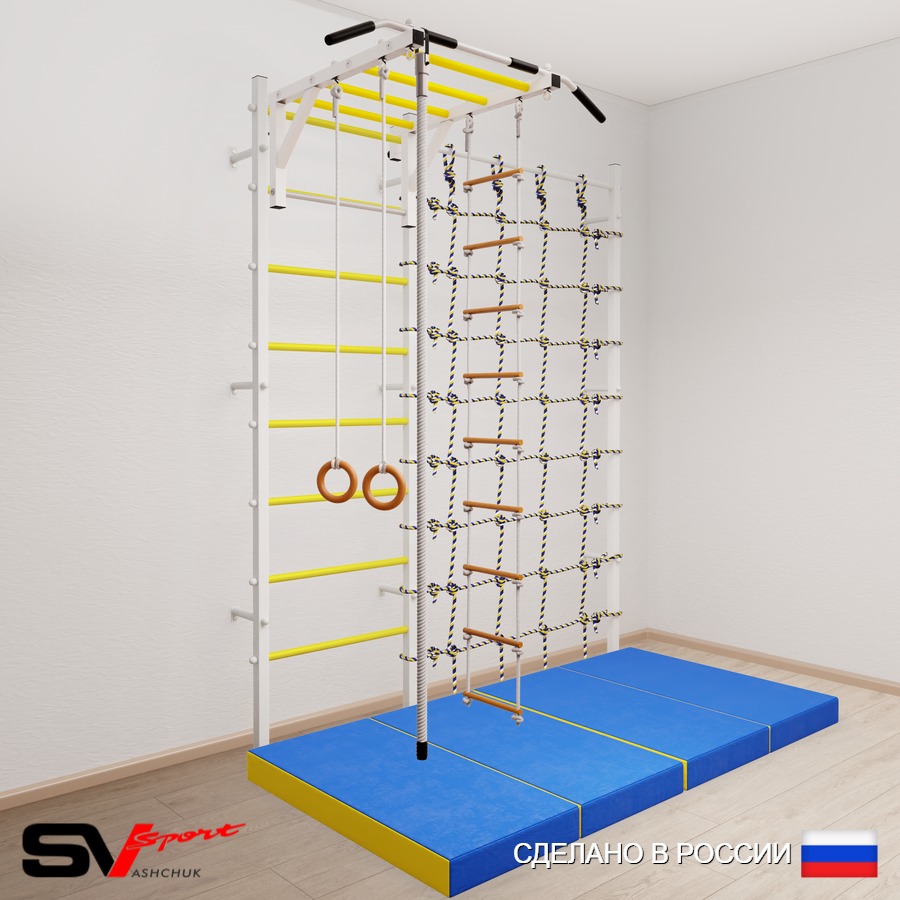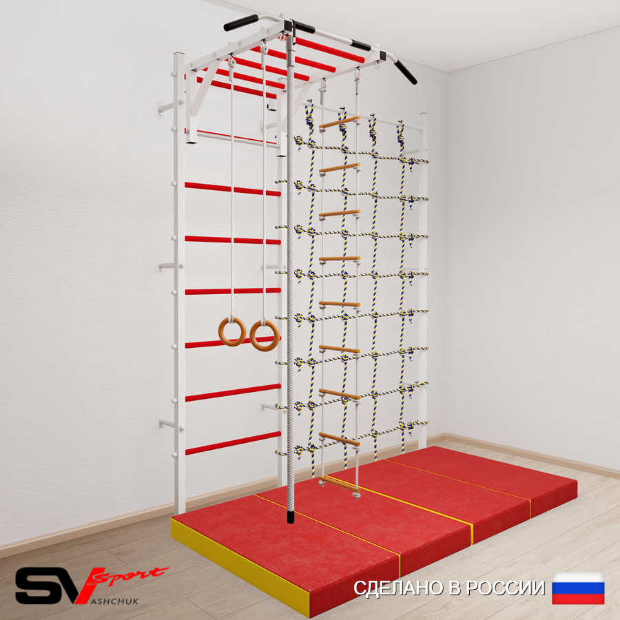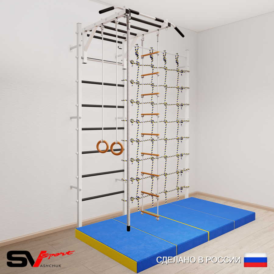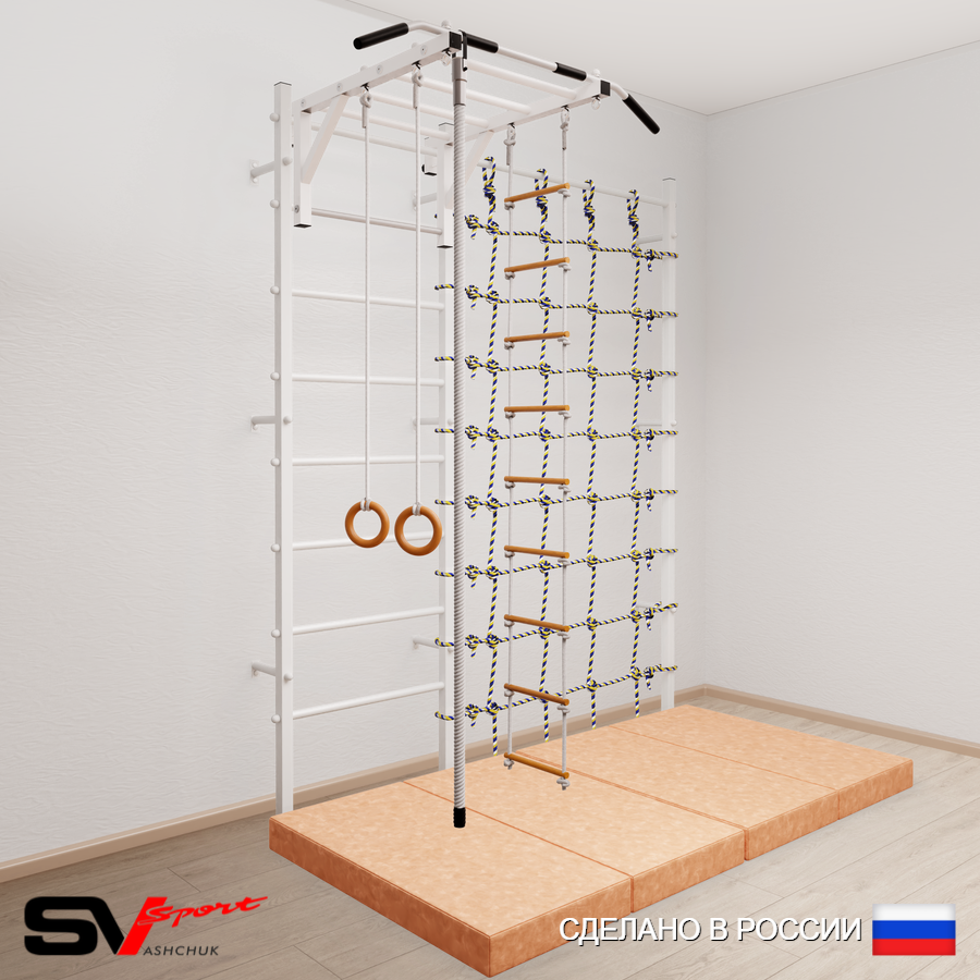 КОМПЛЕКТАЦИЯ: Шведская стенка Sv Sport (профиль вертикальных стоек 40 х 40 х 2 мм), Турник Sv Sport рукоход к ШС, Kанат, Kольца деревянные, Лестница веревочная, Спортивный мат 100 х 200 х 10 см складной, Канатный лаз.