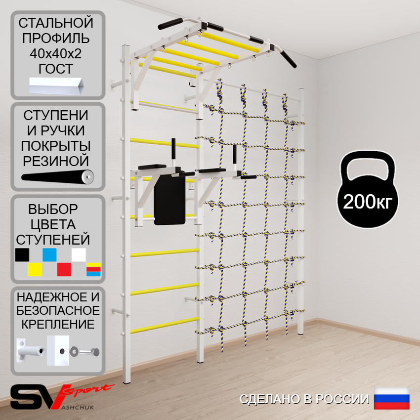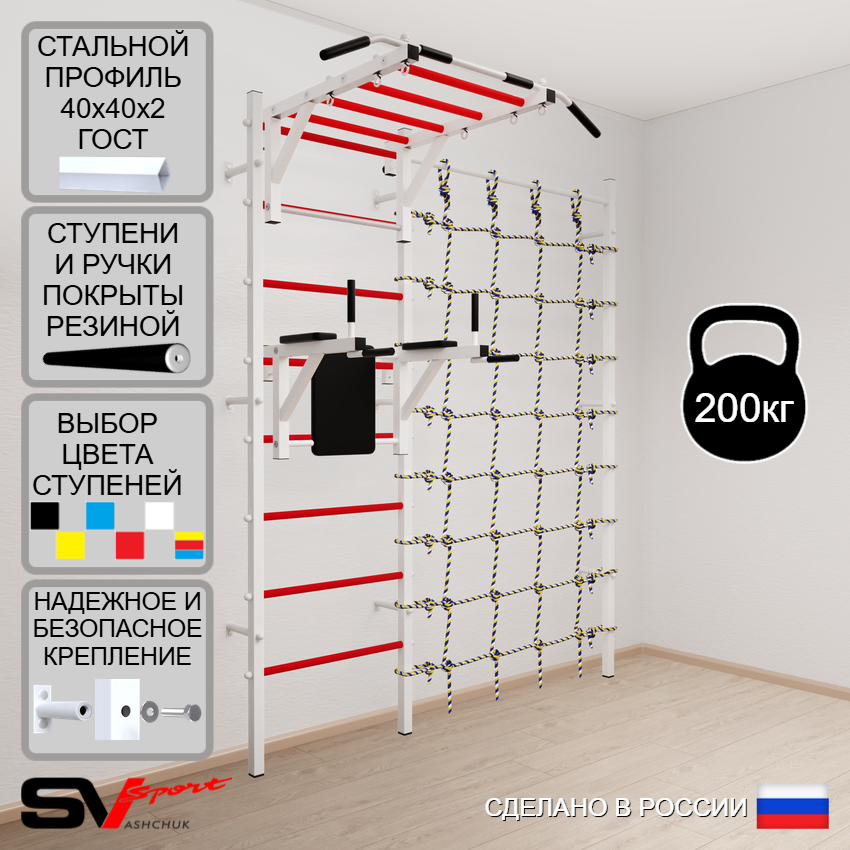 КОМПЛЕКТАЦИЯ: Шведская стенка Sv Sport (профиль вертикальных стоек 40 х 40 х 2 мм), Турник Sv Sport рукоход к ШС, Брусья Sv Sport к ШС, Канатный лаз.
