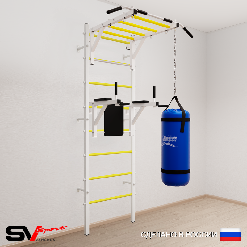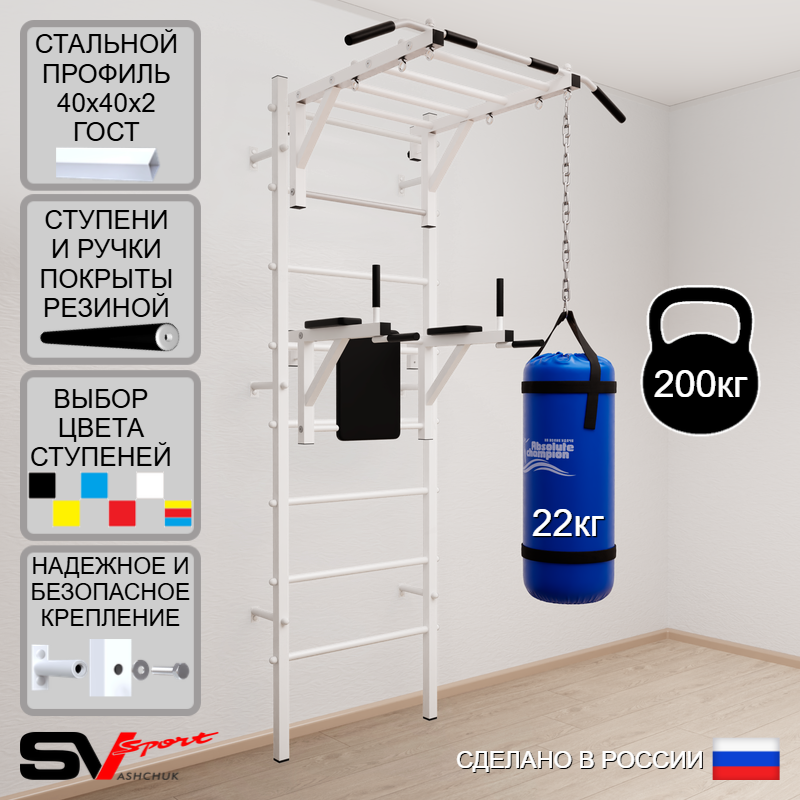 КОМПЛЕКТАЦИЯ: Шведская стенка Sv Sport (профиль вертикальных стоек 40 х 40 х 2 мм), Турник Sv Sport рукоход к ШС, Брусья Sv Sport к ШС, Цепь удлинитель 90см, Мешок боксерский 22кг.