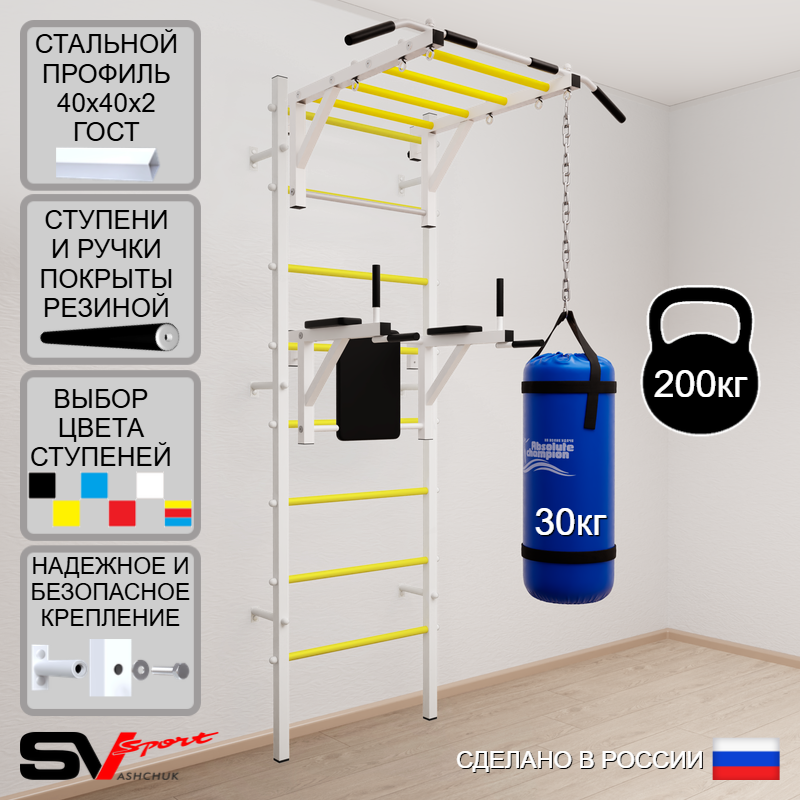КОМПЛЕКТАЦИЯ: Шведская стенка Sv Sport (профиль вертикальных стоек 40 х 40 х 2 мм), Турник Sv Sport рукоход к ШС, Брусья Sv Sport к ШС, Цепь удлинитель 90см, Мешок боксерский 30кг.