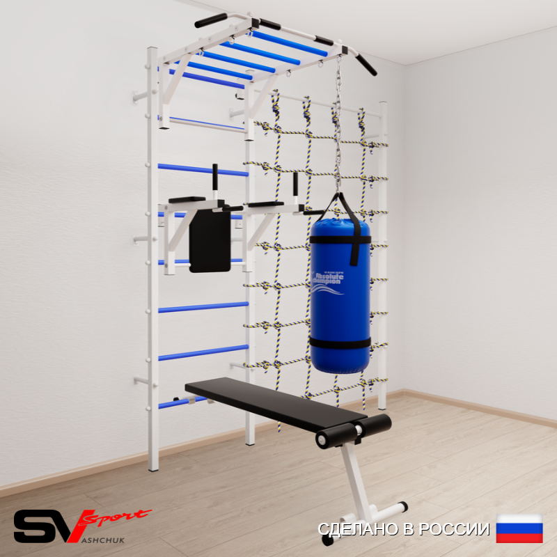 КОМПЛЕКТАЦИЯ: Шведская стенка Sv Sport (профиль вертикальных стоек 40 х 40 х 2 мм), Турник Sv Sport рукоход к ШС, Брусья Sv Sport к ШС, Скамья для пресса и жима Sv Sport к ШС, Цепь удлинитель 90см, Мешок боксерский 30кг, Канатный лаз.