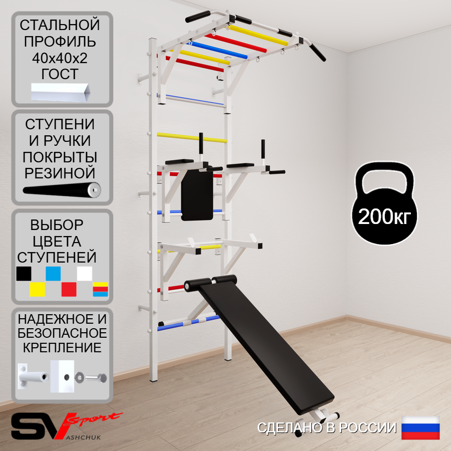 КОМПЛЕКТАЦИЯ: Шведская стенка Sv Sport (профиль вертикальных стоек 40 х 40 х 2 мм), Турник Sv Sport рукоход к ШС, Брусья Sv Sport к ШС, Стойка под штангу Sv Sport к ШС, Скамья для пресса и жима Sv Sport к ШС.