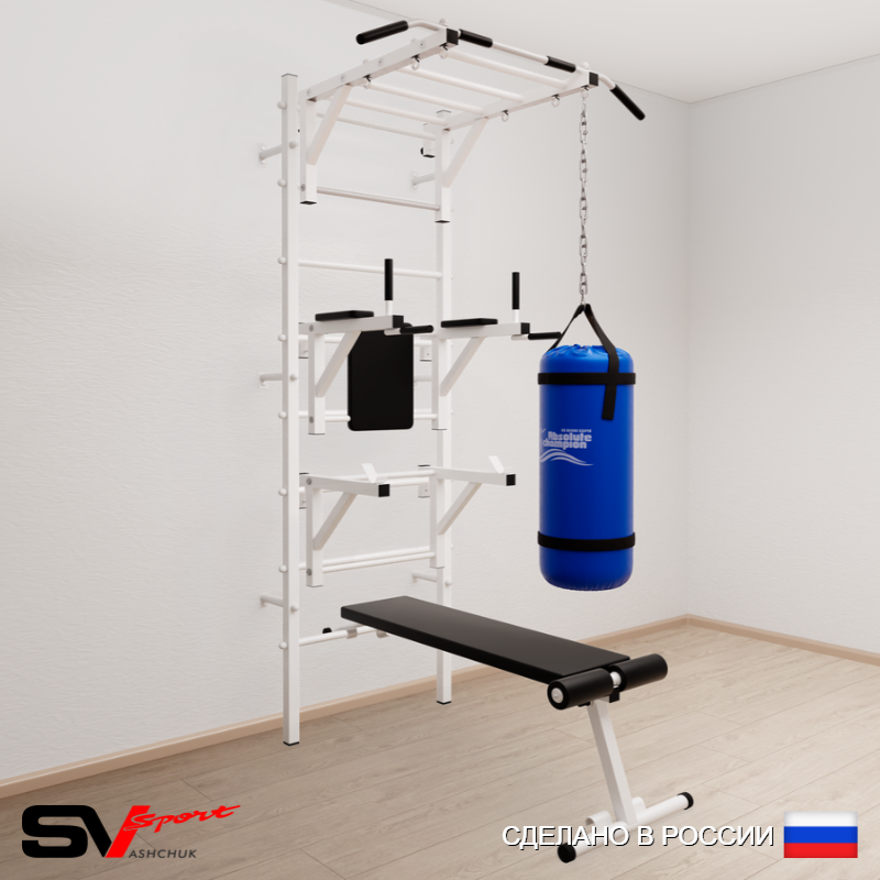 КОМПЛЕКТАЦИЯ: Шведская стенка Sv Sport (профиль вертикальных стоек 40 х 40 х 2 мм), Турник Sv Sport рукоход к ШС, Брусья Sv Sport к ШС, Стойка под штангу Sv Sport к ШС, Скамья для пресса и жима Sv Sport к ШС, Цепь удлинитель 90см, Мешок боксерский 15кг.
