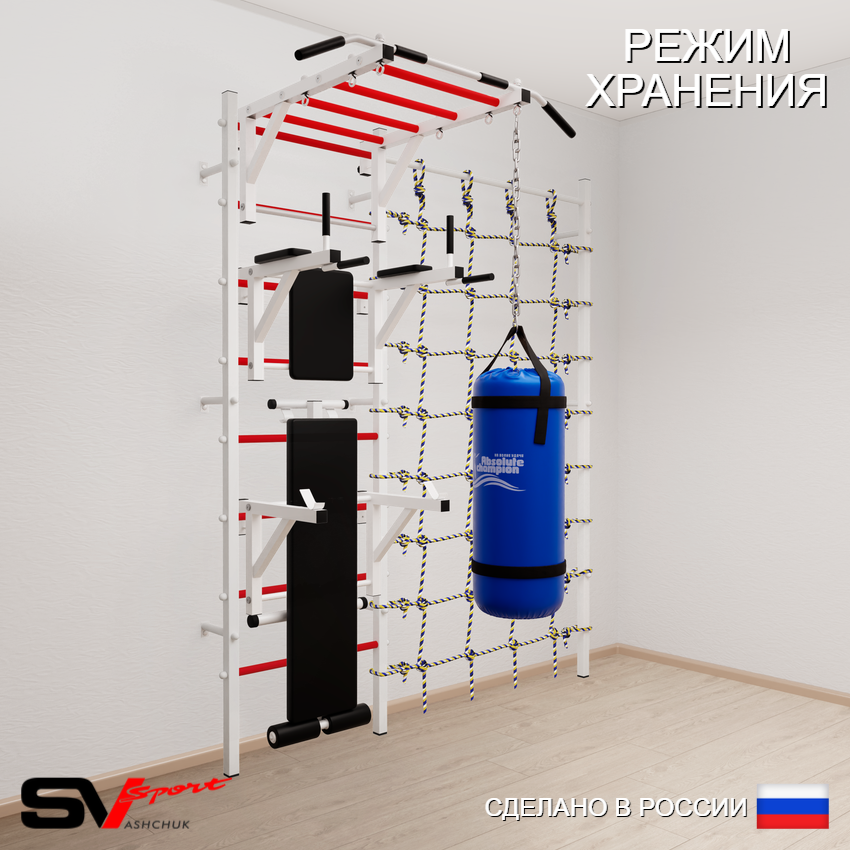 КОМПЛЕКТАЦИЯ: Шведская стенка Sv Sport (профиль вертикальных стоек 40 х 40 х 2 мм), Турник Sv Sport рукоход к ШС, Брусья Sv Sport к ШС, Стойка под штангу Sv Sport к ШС, Скамья для пресса и жима Sv Sport к ШС, Цепь удлинитель 90см, Мешок боксерский 22кг, Канатный лаз.
