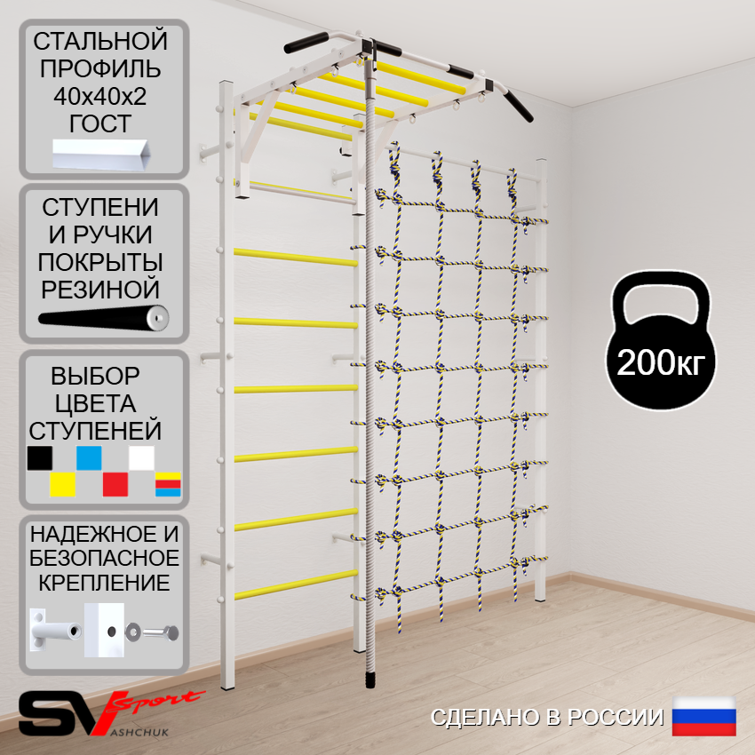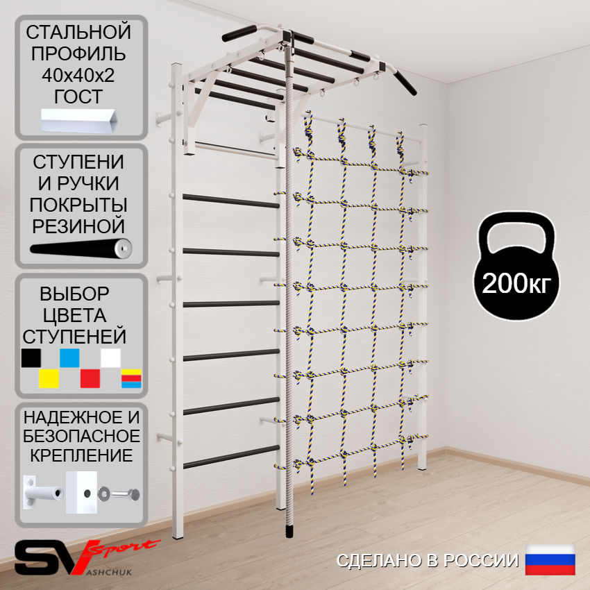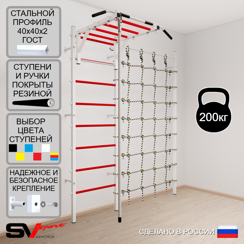 КОМПЛЕКТАЦИЯ: Шведская стенка Sv Sport (профиль вертикальных стоек 40 х 40 х 2 мм), Турник Sv Sport рукоход к ШС, Kанат, Канатный лаз.