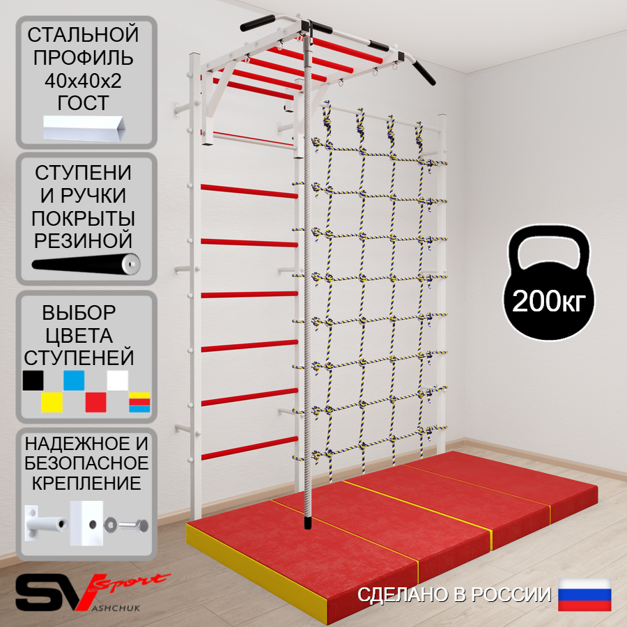 КОМПЛЕКТАЦИЯ: Шведская стенка Sv Sport (профиль вертикальных стоек 40 х 40 х 2 мм), Турник Sv Sport рукоход к ШС, Kанат, Спортивный мат 100 х 200 х 10 см складной, Канатный лаз.