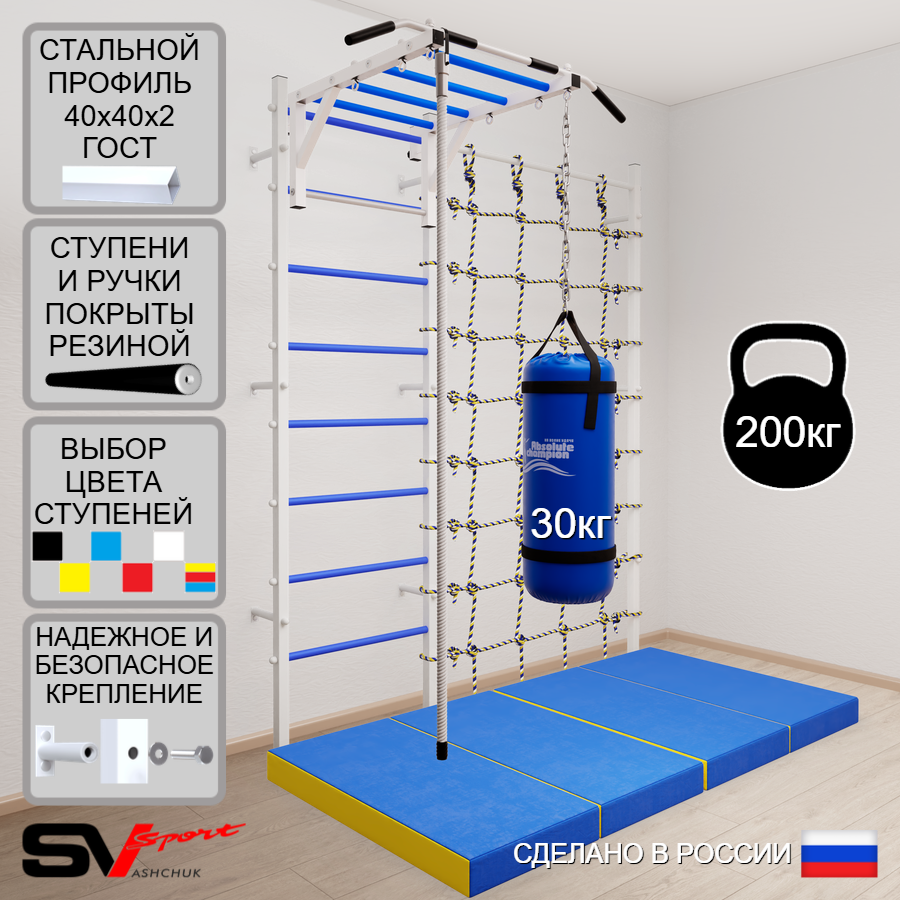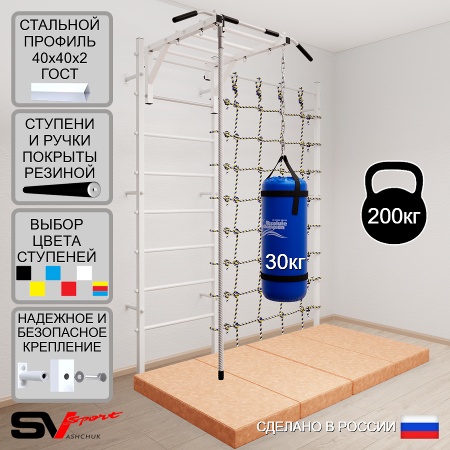 КОМПЛЕКТАЦИЯ: Шведская стенка Sv Sport (профиль вертикальных стоек 40 х 40 х 2 мм), Турник Sv Sport рукоход к ШС, Kанат, Цепь удлинитель 90см, Мешок боксерский 30кг, Спортивный мат 100 х 200 х 10 см складной, Канатный лаз.