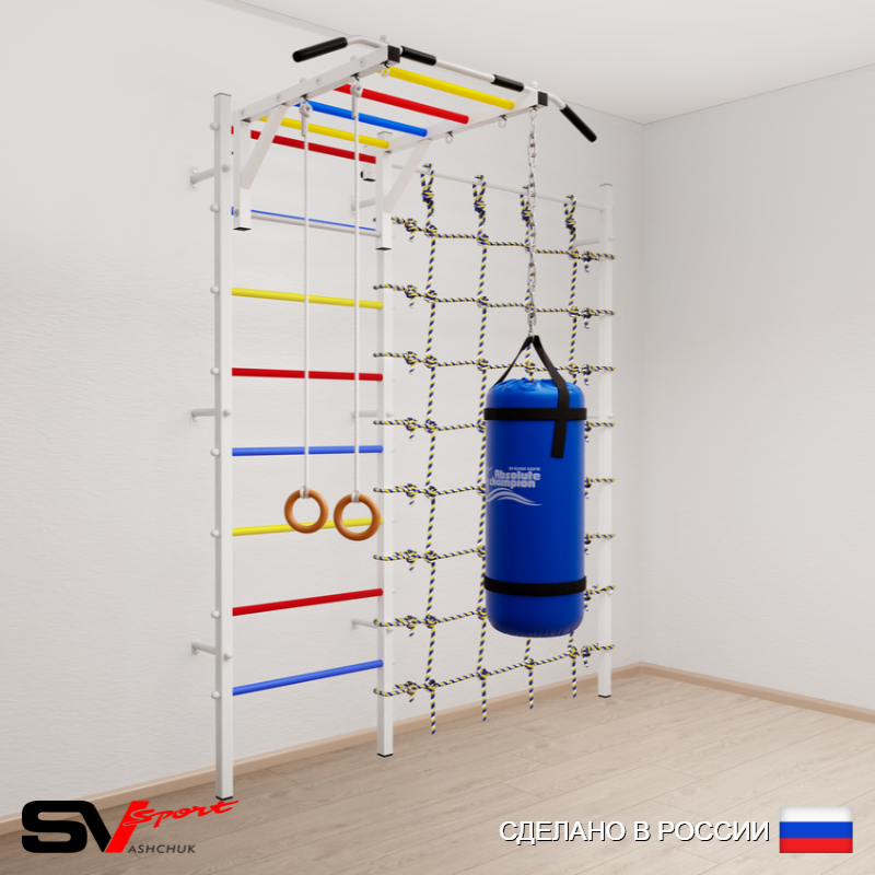 КОМПЛЕКТАЦИЯ: Шведская стенка Sv Sport (профиль вертикальных стоек 40 х 40 х 2 мм), Турник Sv Sport рукоход к ШС, Kольца деревянные, Цепь удлинитель 90см, Мешок боксерский 15кг, Канатный лаз.