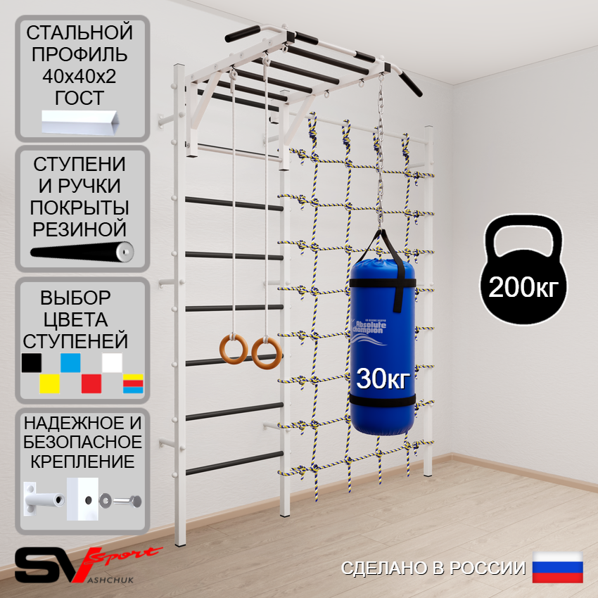 КОМПЛЕКТАЦИЯ: Шведская стенка Sv Sport (профиль вертикальных стоек 40 х 40 х 2 мм), Турник Sv Sport рукоход к ШС, Kольца деревянные, Цепь удлинитель 90см, Мешок боксерский 30кг, Канатный лаз.