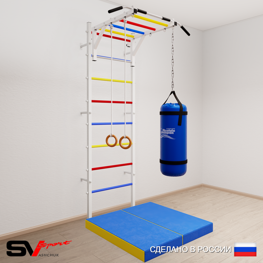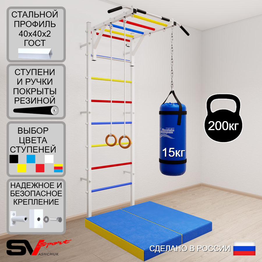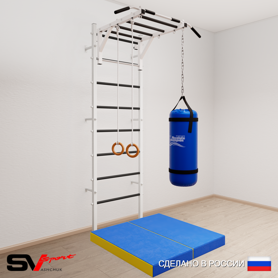 КОМПЛЕКТАЦИЯ: Шведская стенка Sv Sport (профиль вертикальных стоек 40 х 40 х 2 мм), Турник Sv Sport рукоход к ШС, Kольца деревянные, Цепь удлинитель 90см, Мешок боксерский 15кг, Спортивный мат 100 х 100 х 10 см складной.