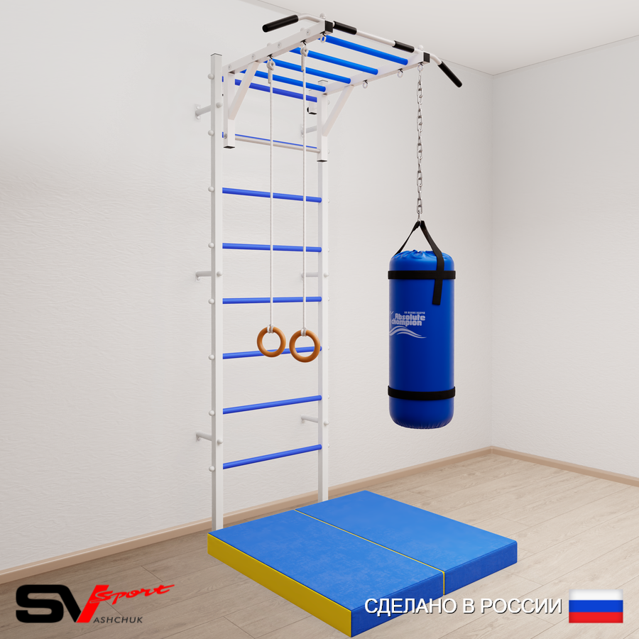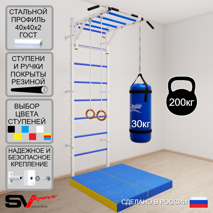 КОМПЛЕКТАЦИЯ: Шведская стенка Sv Sport (профиль вертикальных стоек 40 х 40 х 2 мм), Турник Sv Sport рукоход к ШС, Kольца деревянные, Цепь удлинитель 90см, Мешок боксерский 30кг, Спортивный мат 100 х 100 х 10 см складной.