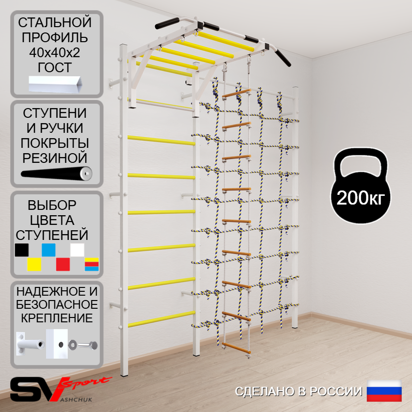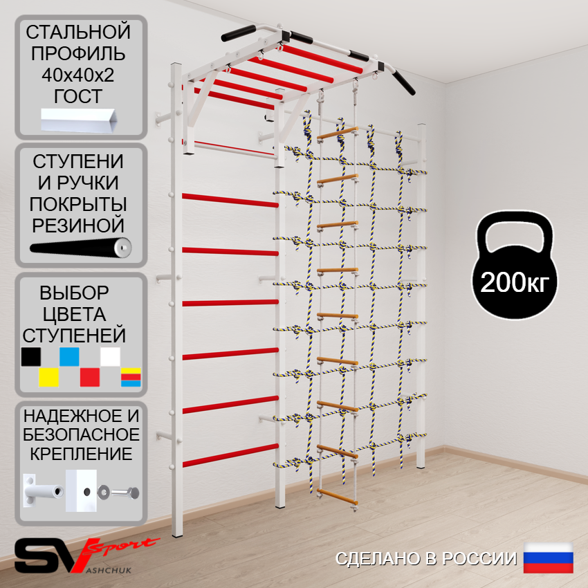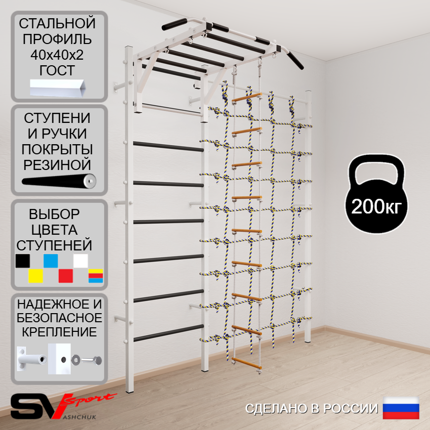 КОМПЛЕКТАЦИЯ: Шведская стенка Sv Sport (профиль вертикальных стоек 40 х 40 х 2 мм), Турник Sv Sport рукоход к ШС, Лестница веревочная, Канатный лаз.