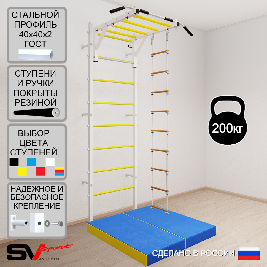 КОМПЛЕКТАЦИЯ: Шведская стенка Sv Sport (профиль вертикальных стоек 40 х 40 х 2 мм), Турник Sv Sport рукоход к ШС, Лестница веревочная, Спортивный мат 100 х 100 х 10 см складной.