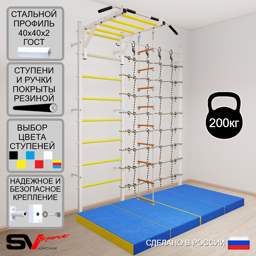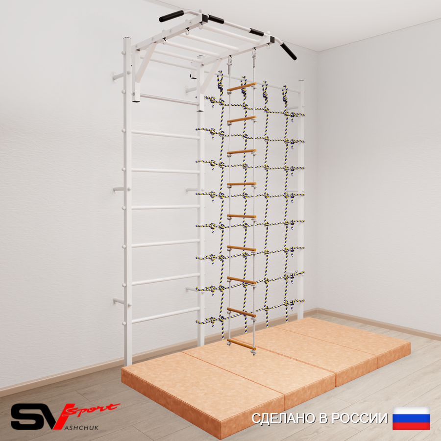 КОМПЛЕКТАЦИЯ: Шведская стенка Sv Sport (профиль вертикальных стоек 40 х 40 х 2 мм), Турник Sv Sport рукоход к ШС, Лестница веревочная, Спортивный мат 100 х 200 х 10 см складной, Канатный лаз.